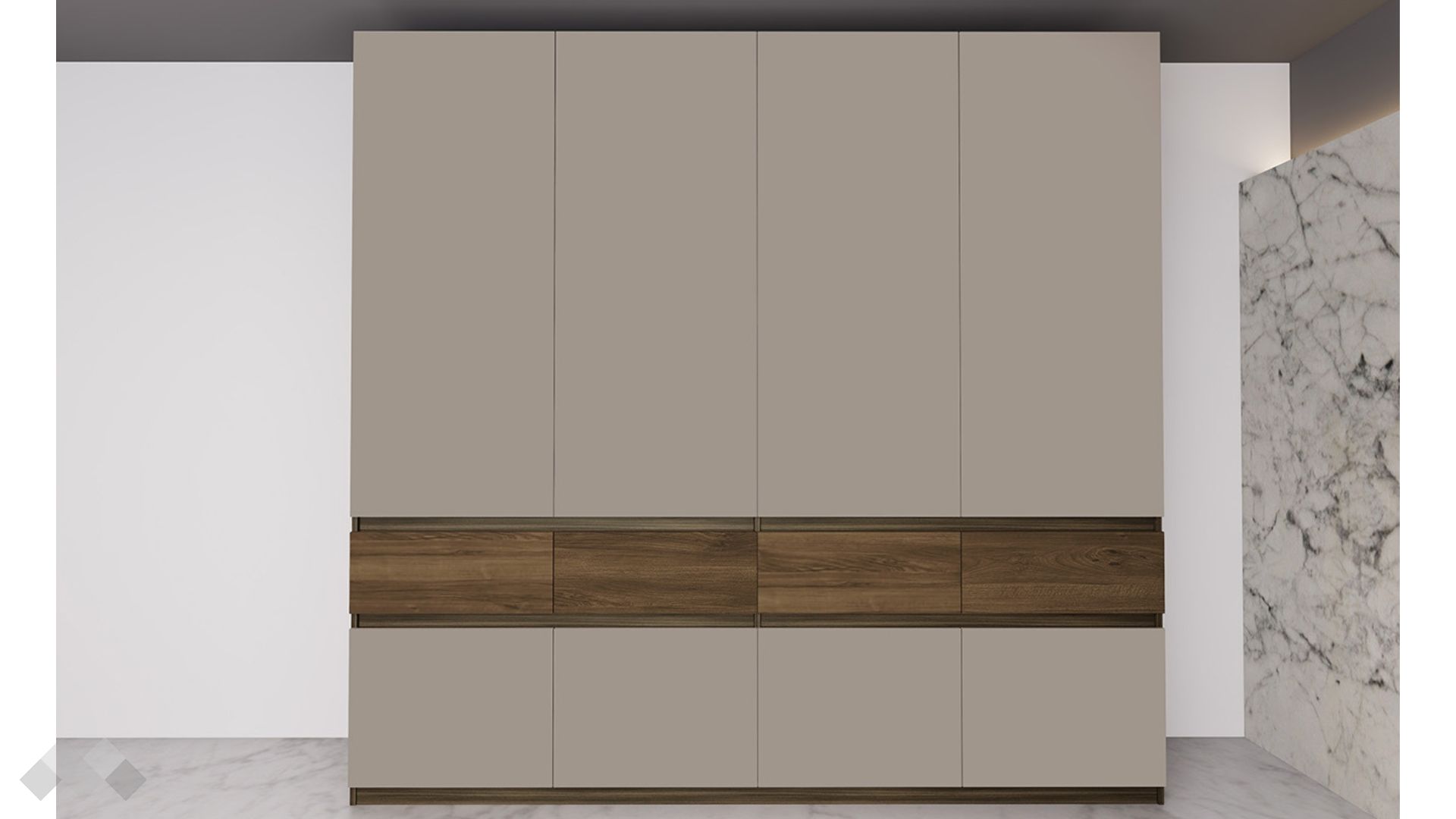Изчистените матови врати подчертават модерната визия на гардероба. Вътрешното разпределение е добре организирано, осигурявайки достатъчно място за подредба на дрехи и аксесоари. Разполага с четири чекмеджета за дрехите, които държиш да са сгънати, два лоста за закачалки, за тези които не искаш да гладиш и два шкафа за кутийте с обувки или спално бельо.