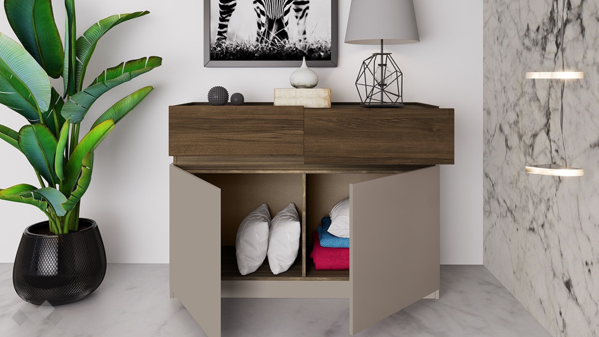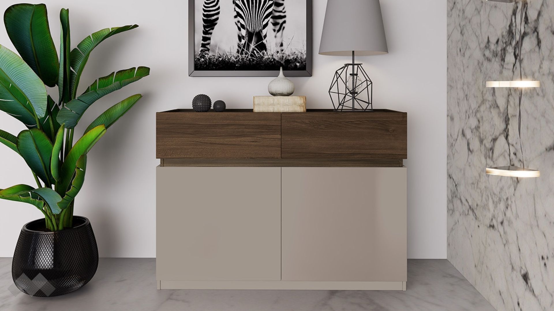 ⭐ Предимства: ✓ 18 мм МДФ и 16 мм ПДЧ ✓ 2 чекмеджета ✓ 2 шкафа ✓ механизъм за плавно затваряне на врати и чекмеджета ✓ сачмени водачи ✓ модерен декор ✓ качествена изработка