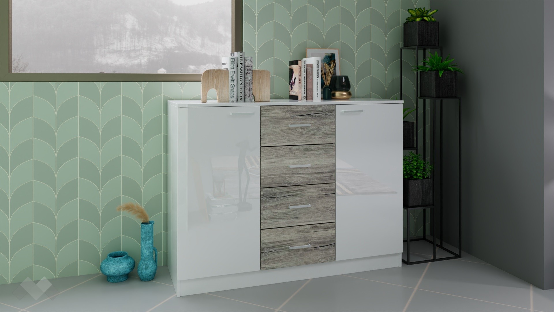 На твое разположение са четири чекмеджета, подходящи за бельо, чорапи или малки ел. уреди. Зад вратите на двата затворени шкафа се крият рафтовеа, където можеш да организираш сгънати дрехи, аксесоари или други необходими за теб неща. Горният плот е идеален за подреждане на декорации, книги, козметика, бижута или други вещи, които искаш да ти бъдат винаги под ръка.