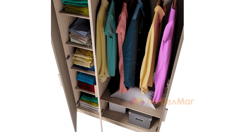 Гардероб Провидънс се състои от лост и рафт зад двете врати, както и 4 рафта в третото крило. Друго предимство е централното огледало, което не само че прави стаята по-осветена, но и е верен помощник в избора на тоалет всеки ден. Гардеробът има уникално разпределение, което ще ти позволи да подредиш добре всички дрехи и аксесоари.
