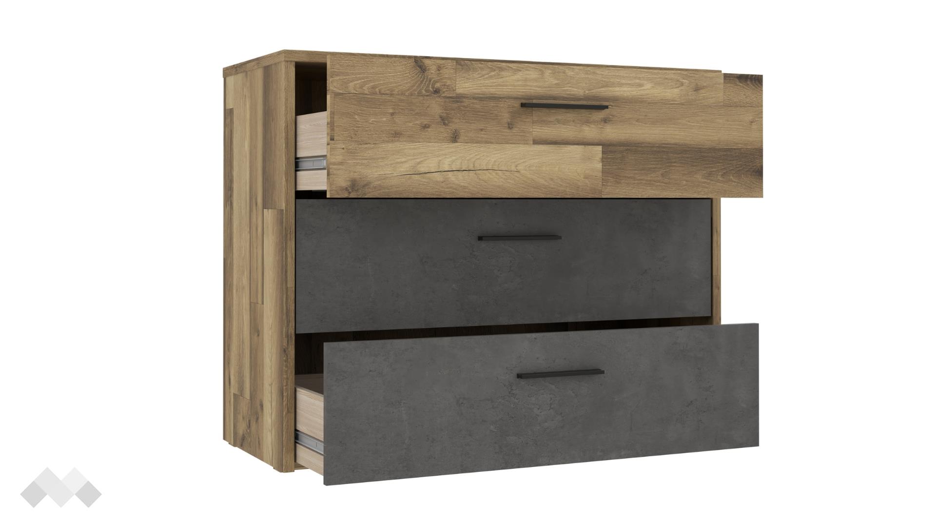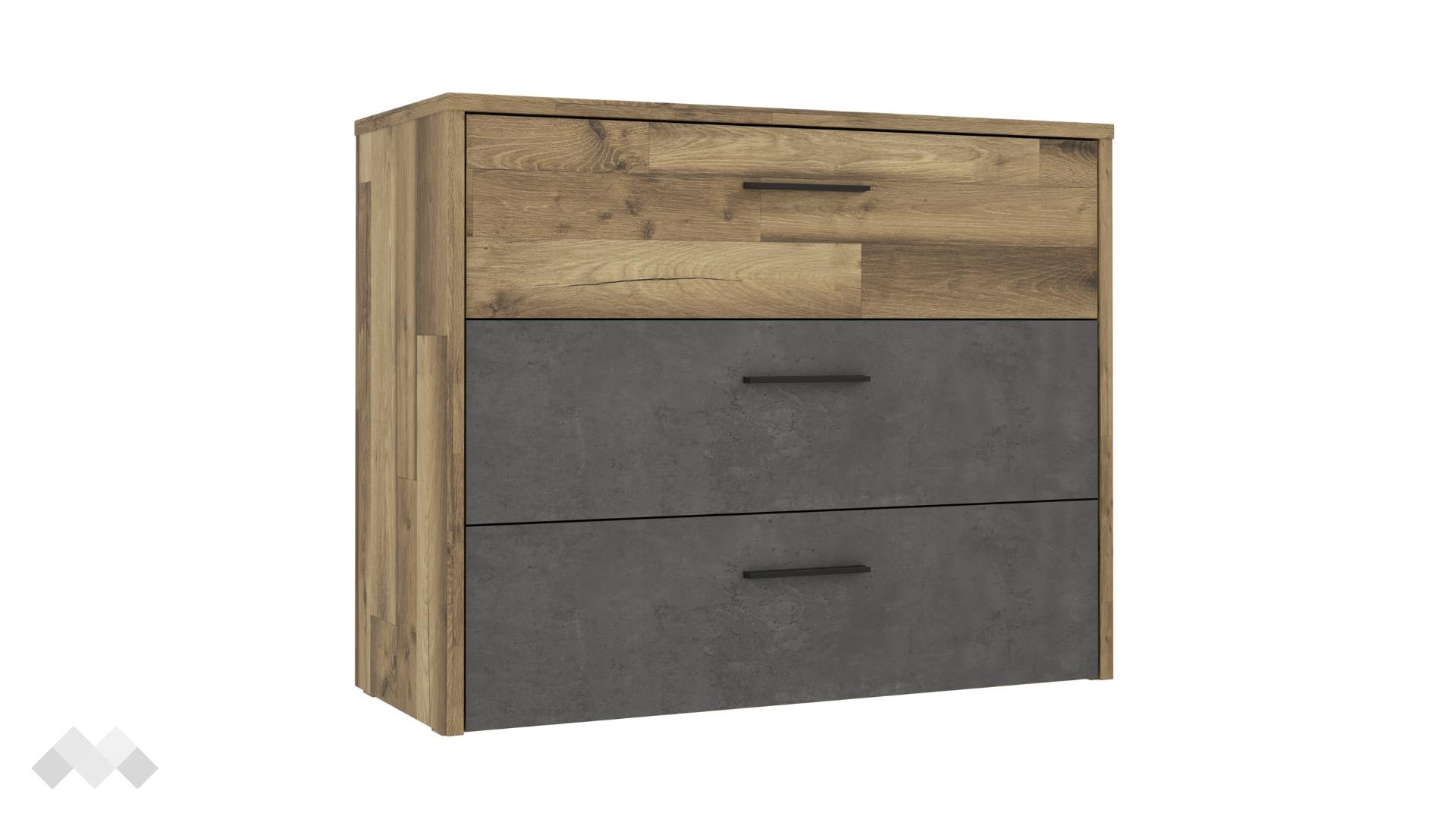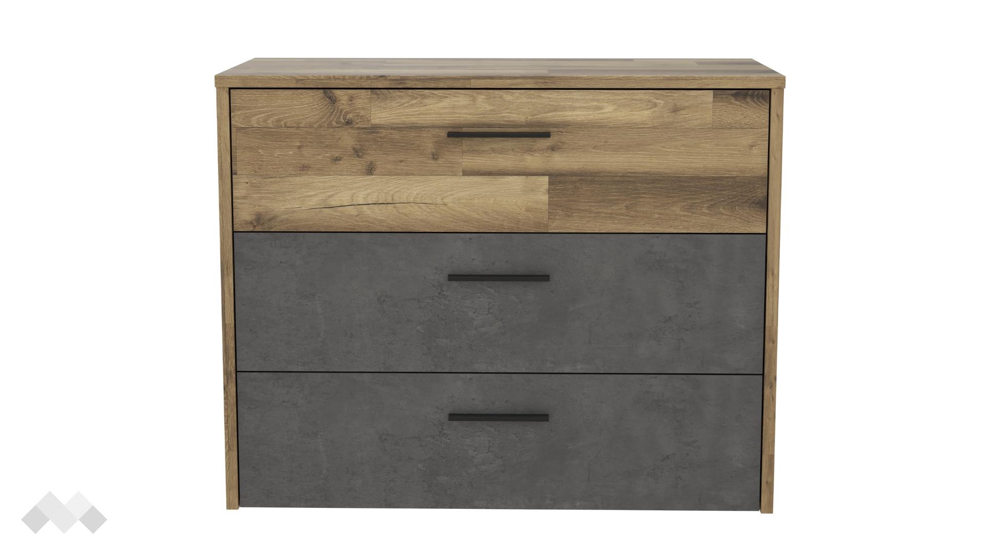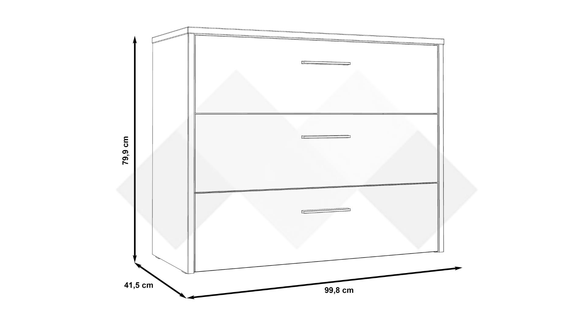 Скрин Ричиано е стилно и практично допълнение към всяка спалня, дневна или коридор. С трите си чекмеджета предлага удобно място за съхранение на дрехи, бельо, аксесоари или документи, като същевременно запазва изчистена визия.