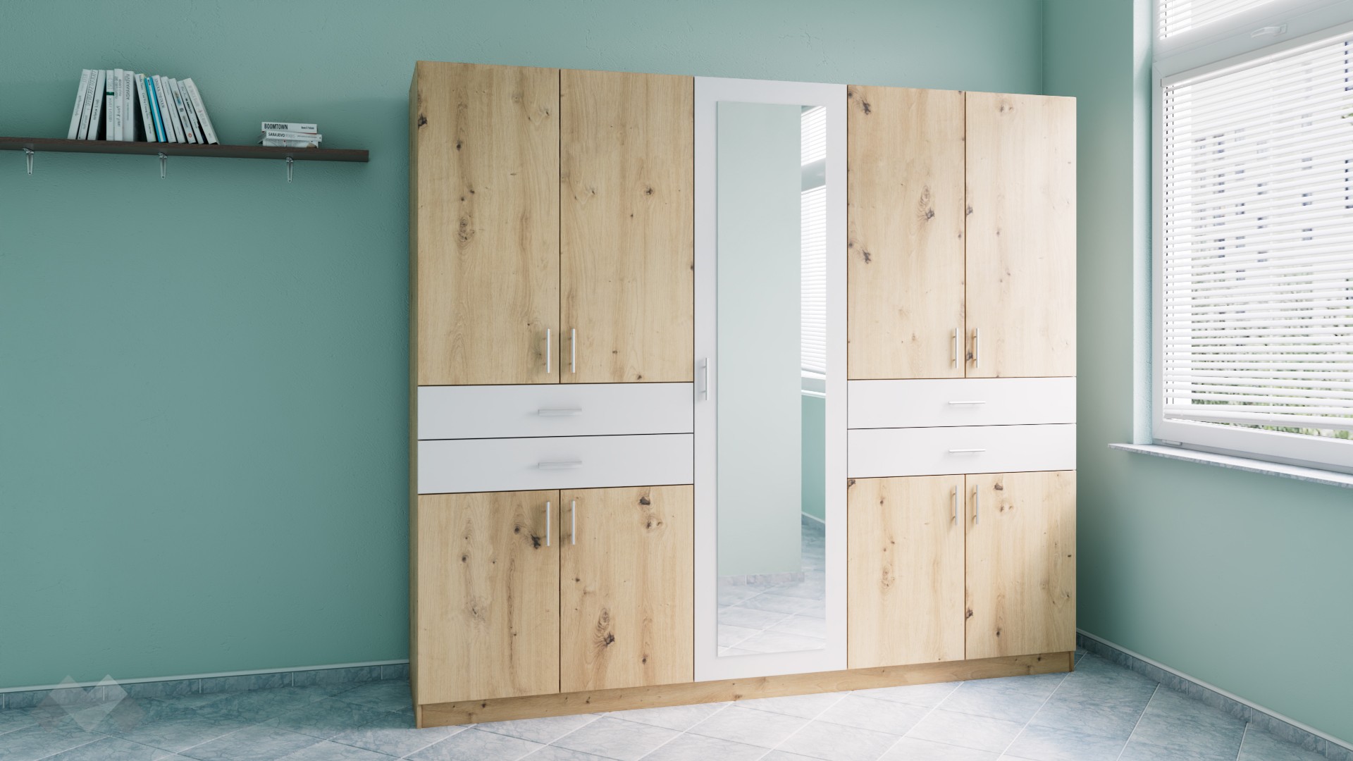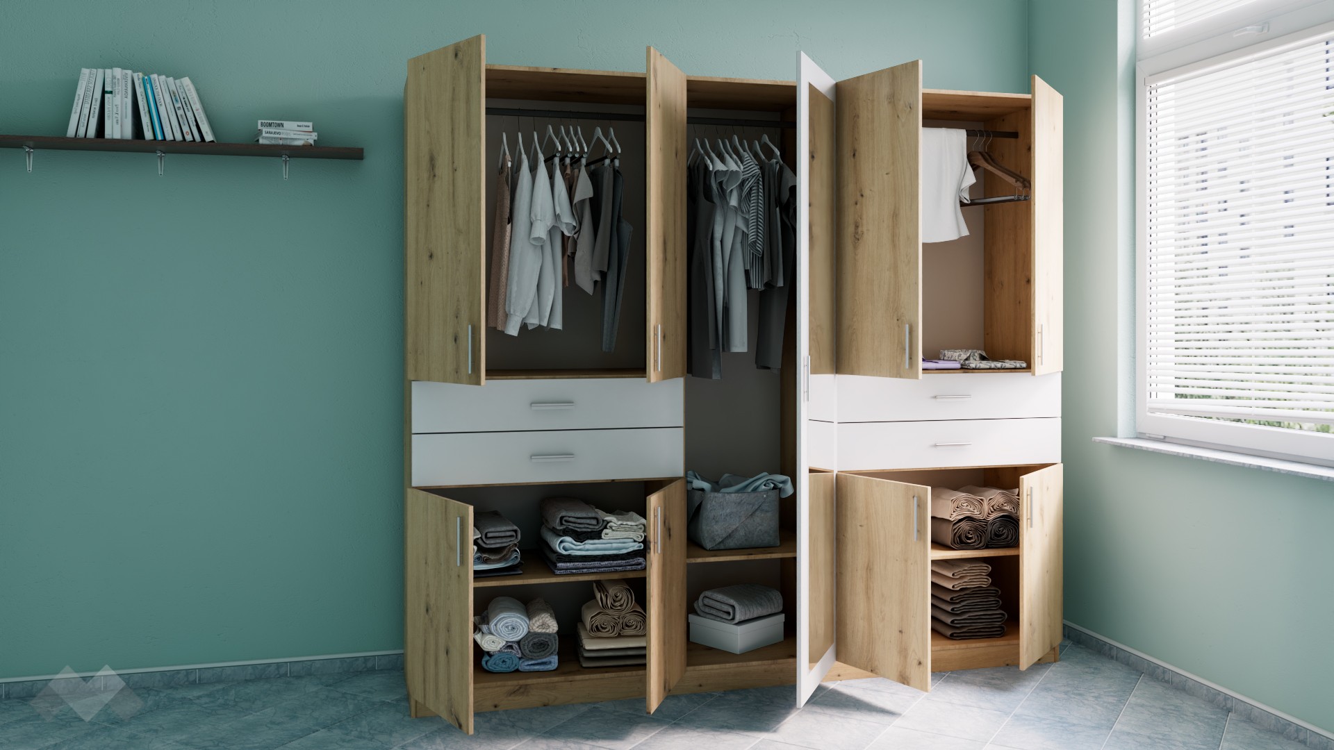 ⭐ Предимства: ✓ петкрилен ✓ 4 чекмеджета ✓ 3 рафта ✓ 2 шкафа ✓ 3 лоста за закачалки ✓ модерен декор с WNR структура ✓ практично разпределение ✓ качествена изработка ✓ 16 мм ПДЧ
