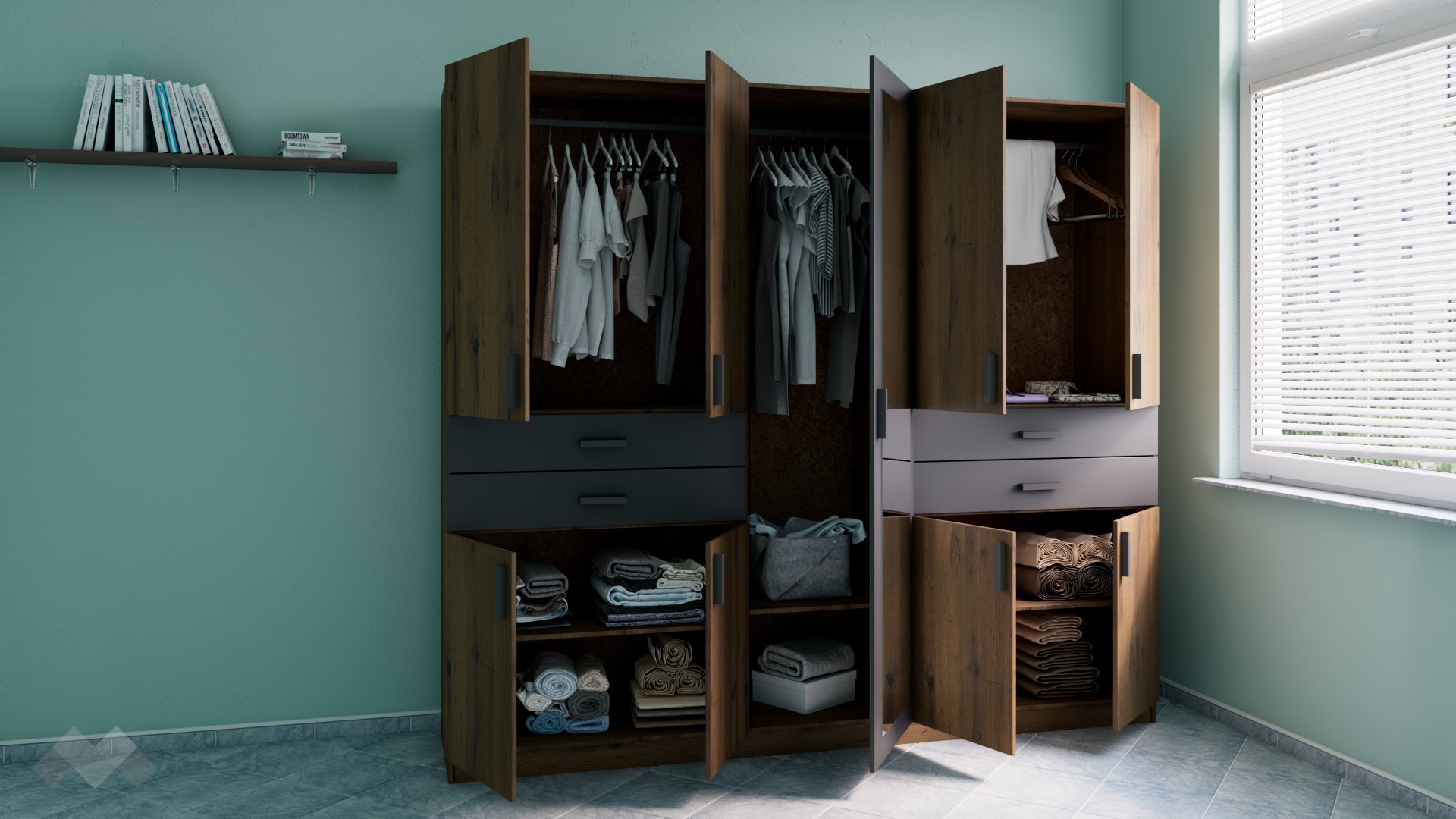 Благодарение на четирите чекмеджета и двата затворени шкафа с по един рафт, разполагаш с достатъчно място за организация на всякакви вещи и дребни ел. уреди. Гардеробът разполага с 3 рафта за дрехите, които съхраняваш сгънати – тениски, пуловери, дънки и други. Отделенията с лостовете за закачалки са подходящи за съхранение на елегантното облекло, което се мачка много лесно, като ризи, рокли, сака и други.