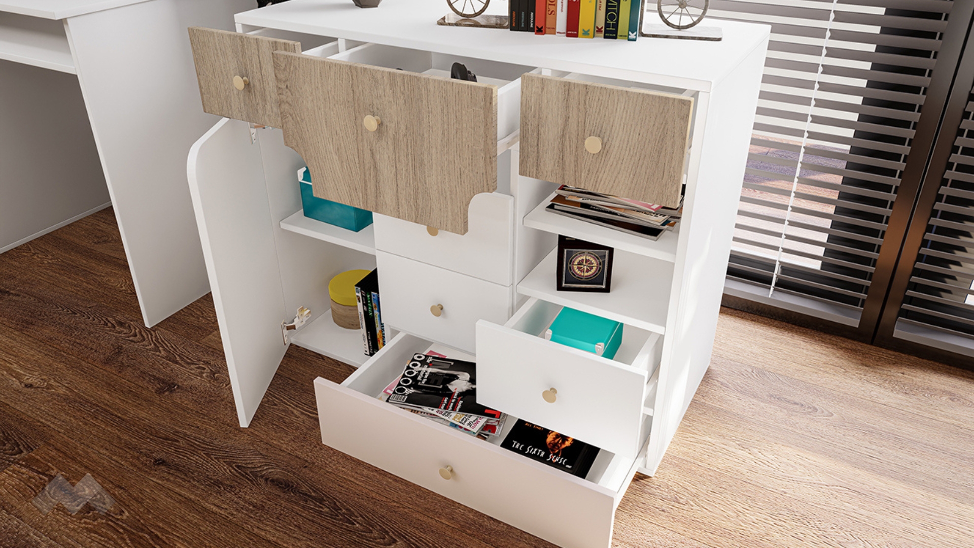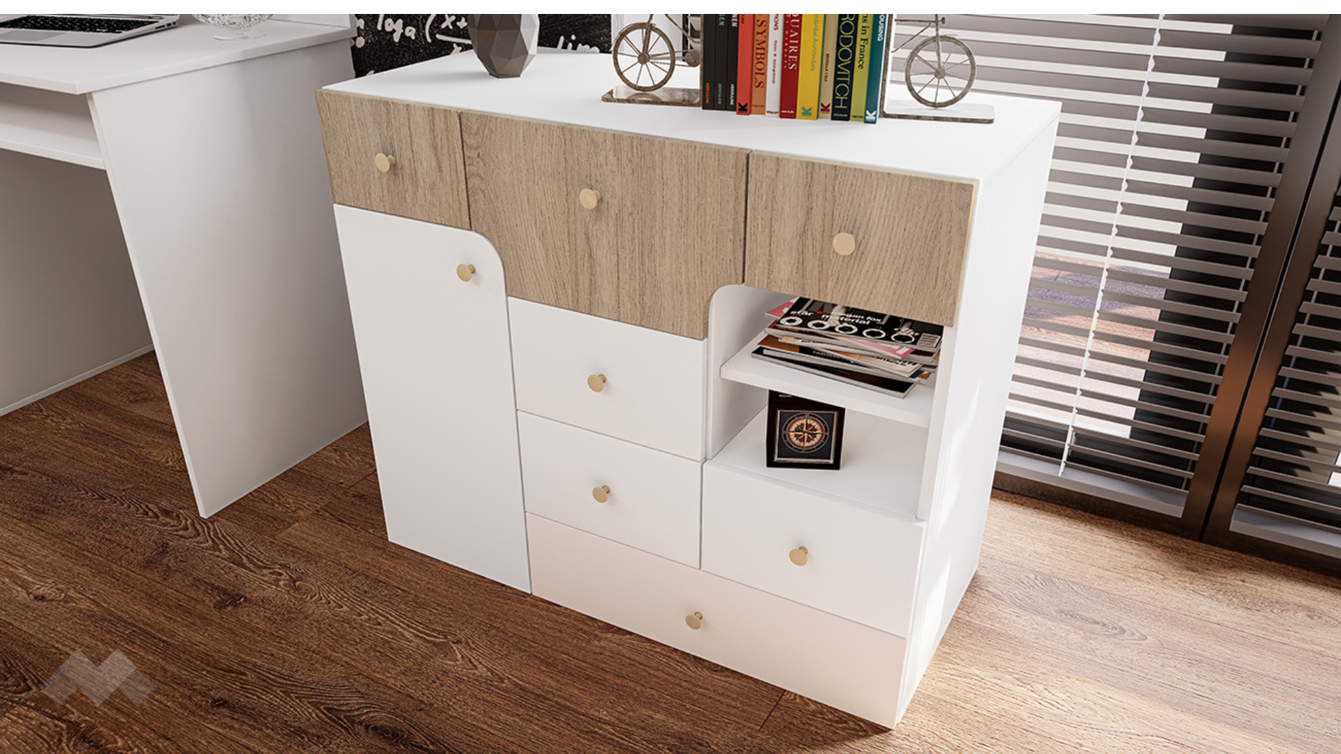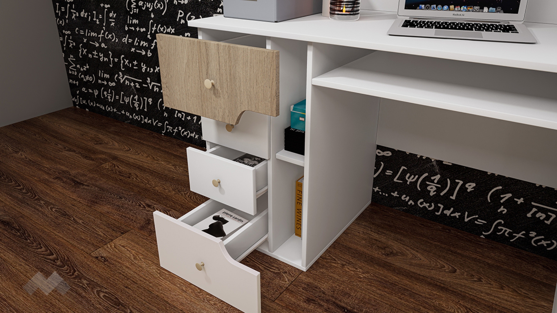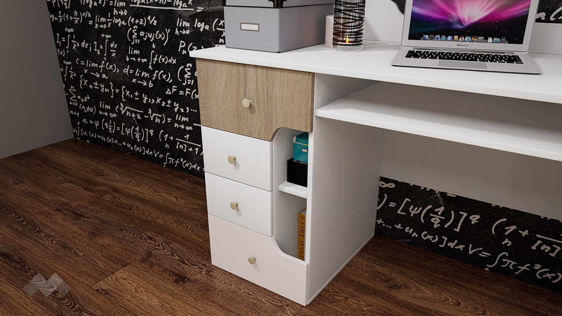 Скрин с множество чекмеджета, шкаф и две ниши. В него може да намериш достатъчно място за всички играчки, принадлежности или други вещи. Бюро с четири чекмеджета, ниши, плот за клавиатура и етажерка, която да монтираш над него, прекрасен начин да въведеш ред в помещението и възможност да декорираш нови уютни кътчета или закътани пространства.