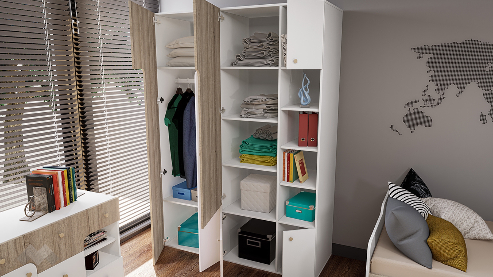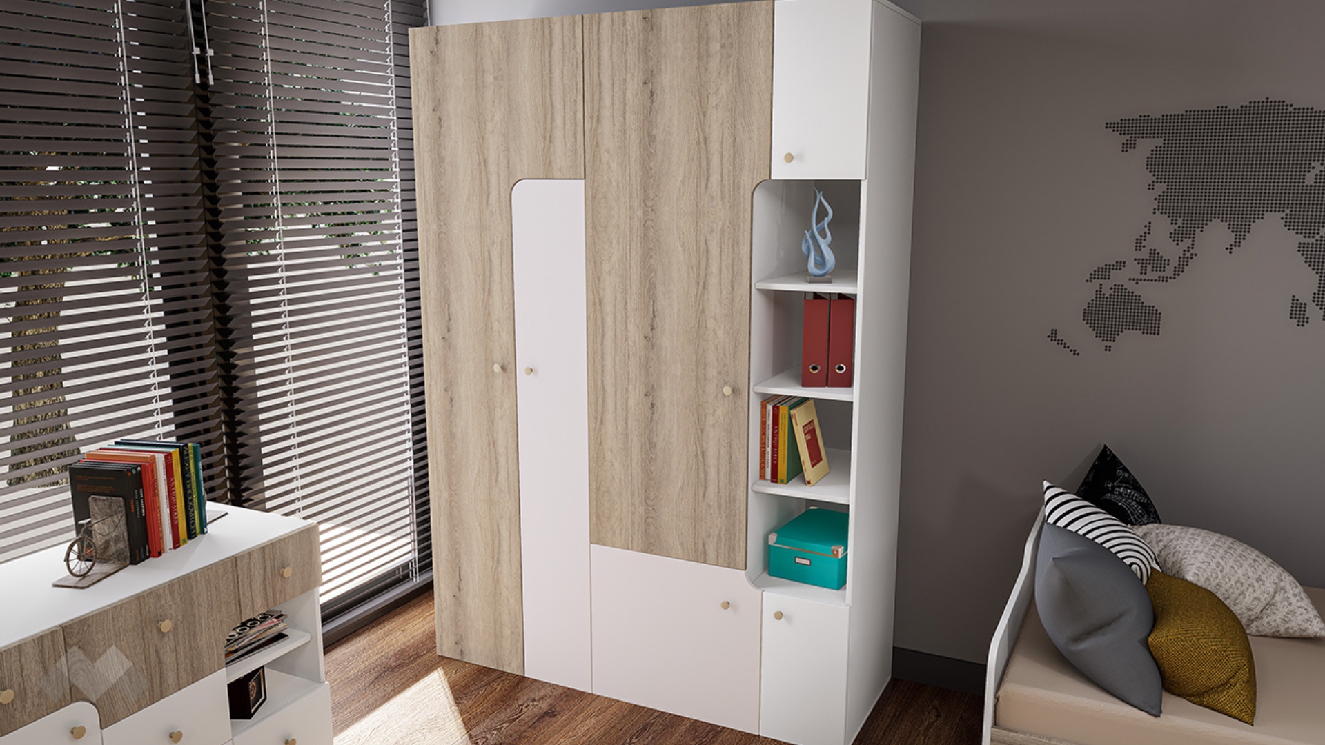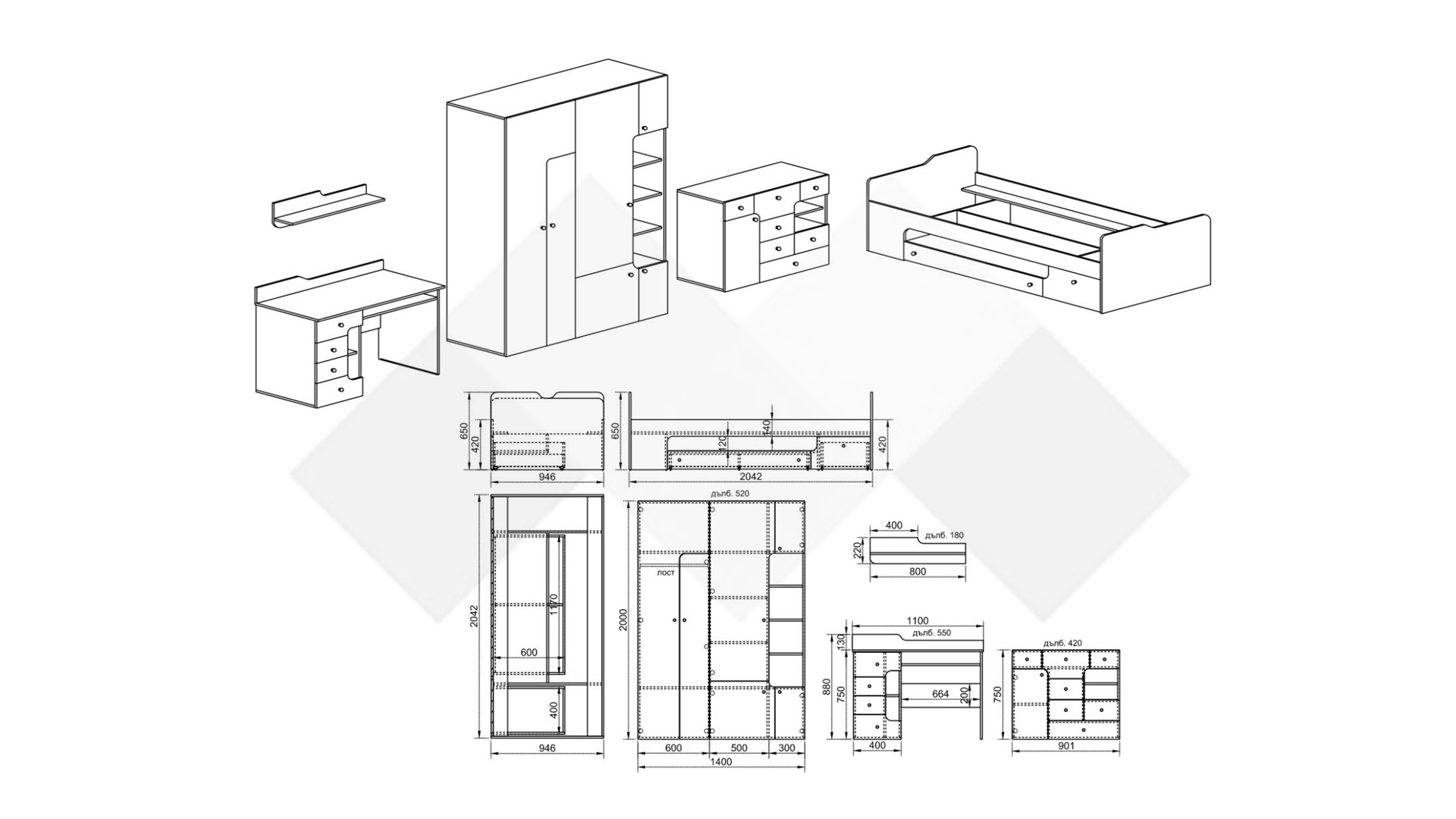 ✓ легло с допълнителни чекмеджета и ниши ✓ скрин ✓ гардероб ✓ бюро ✓ свежи цветове ✓ 16 мм ПДЧ и 18 мм МДФ