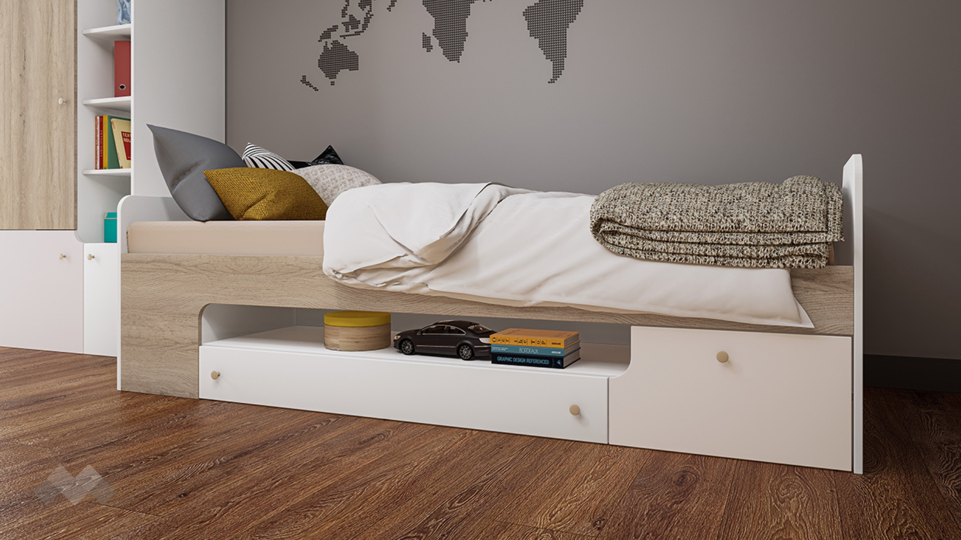 Комплектът включва легло с две чекмеджета и ниша в долната му част, там може да поставиш най-необходимите за детето вещи, които да са винаги под ръка. Леглото е за матрак с размер 90/200 см – достатъчно голямо, за да предостави необходимия комфорт за сън.