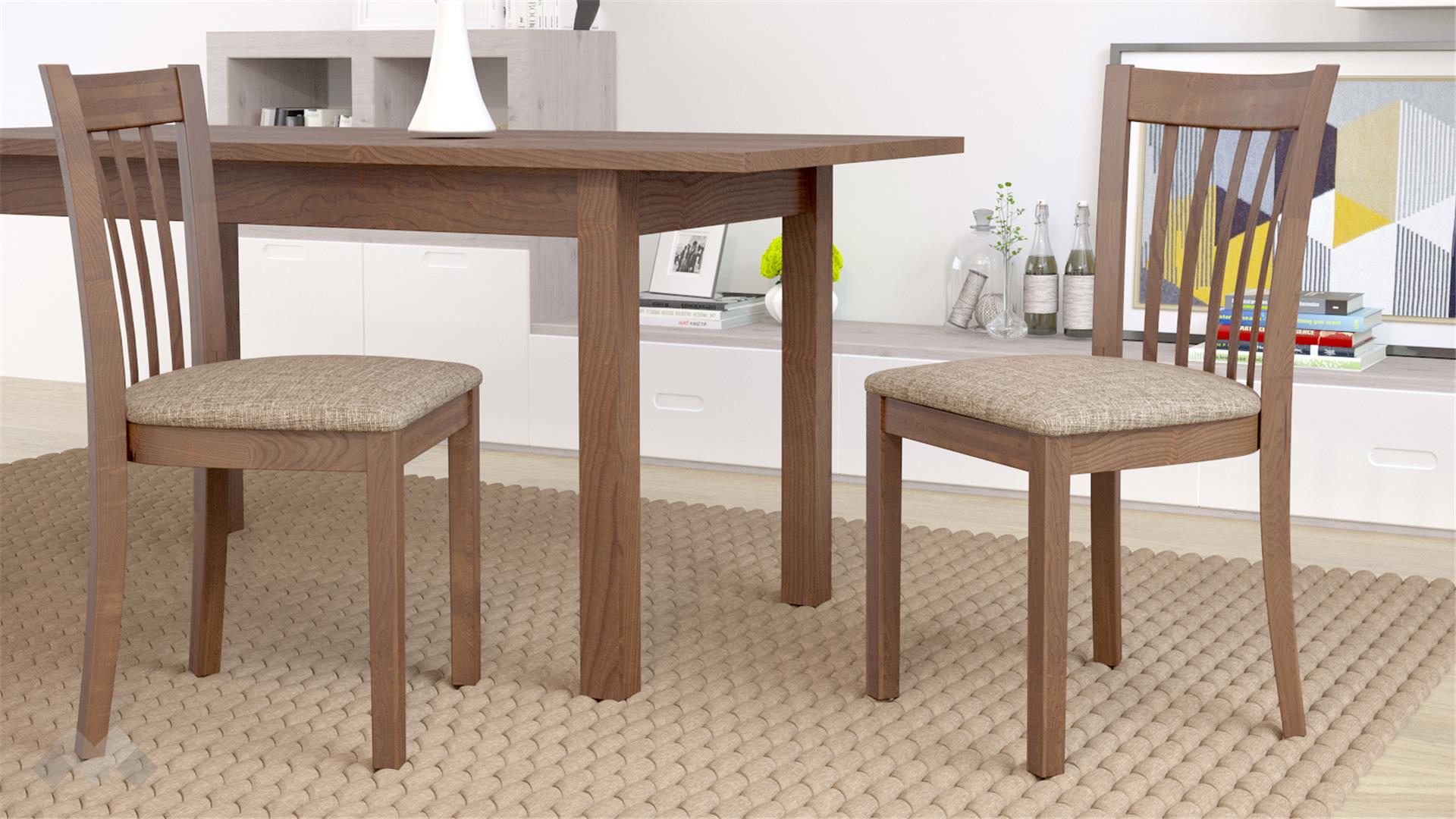 Столът е със здрава конструкция от естествена букова дървесина за устойчивост и стабилност, а лаковото покритие добавя елегантност. Седалката е проектирана с твърда основа, тапицирана с дунапрен за повече комфорт при седене и завършен със здрава текстилна дамаска, лесна за поддръжка.