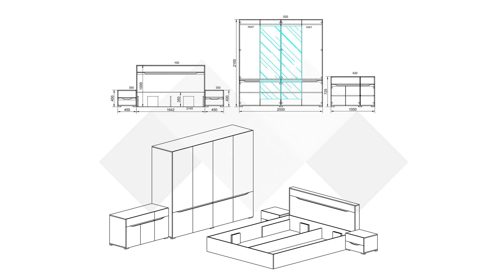 ⭐ Предимства: ✓ голям гардероб с огледала и LED осветление ✓ включен повдигащ механизъм с дъно ✓ нощни шкафчета ✓ красива и стилна цветова комбинация ✓ скрин ✓ 16 мм ПДЧ