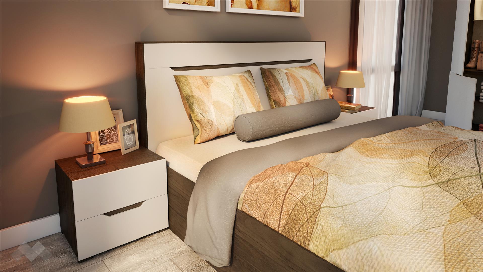 Спалнята е голяма и удобна - за матрак 160/200, с ефектна табла, а допълващите я нощни шкафчета позволяват да ѝ придадеш завършен вид с поставянето на нощни лампи или декорации.