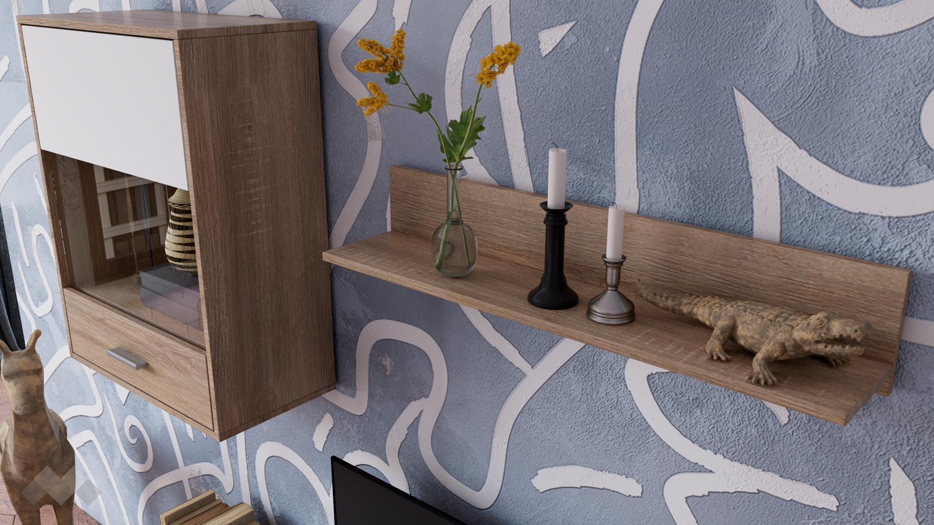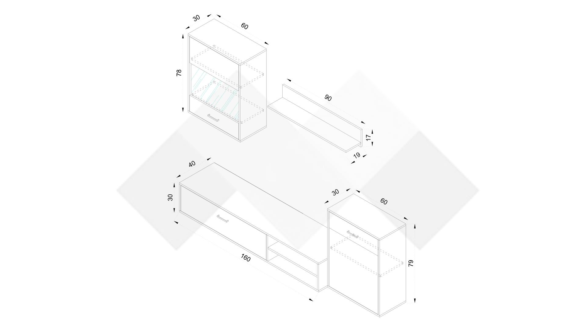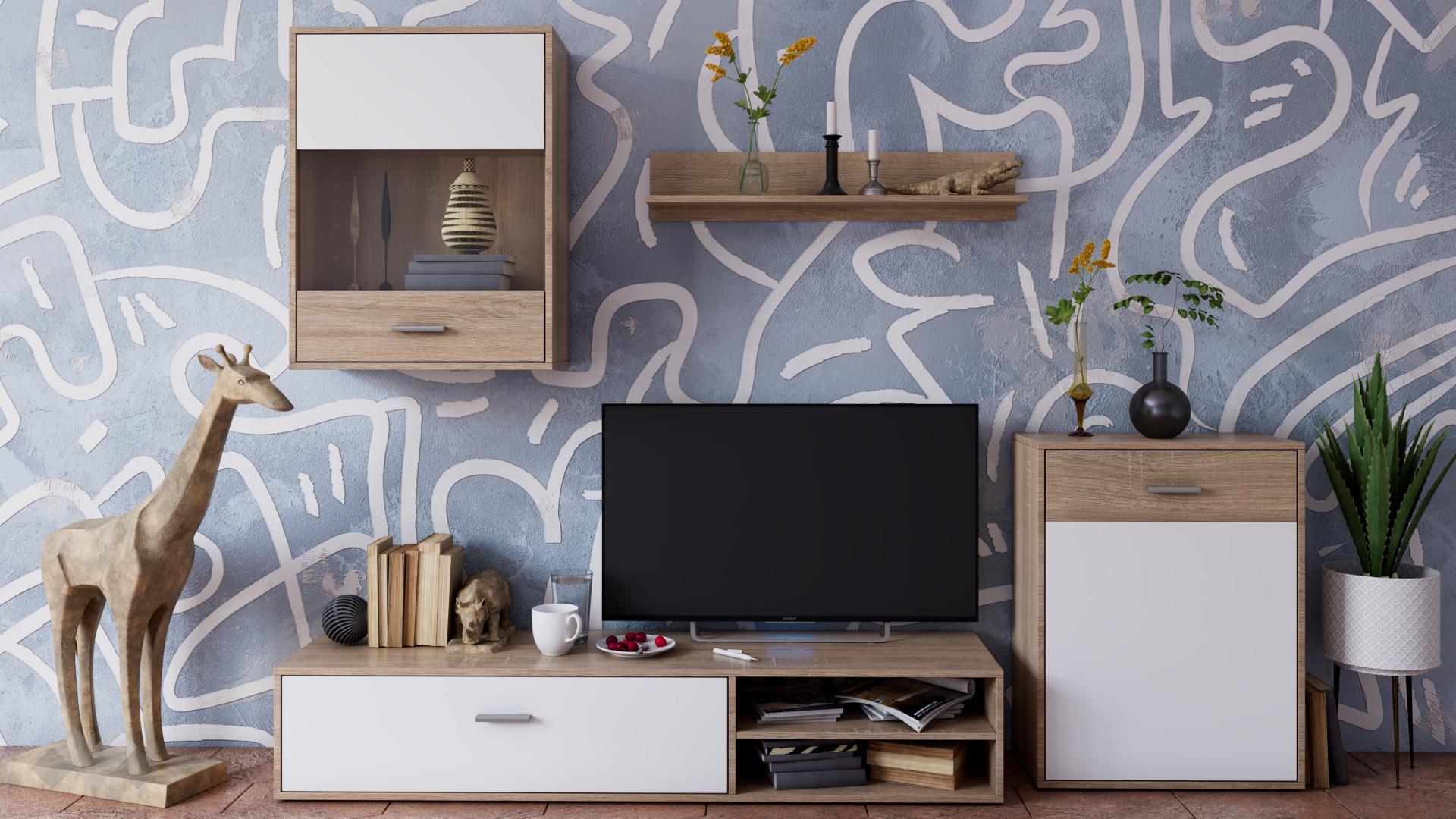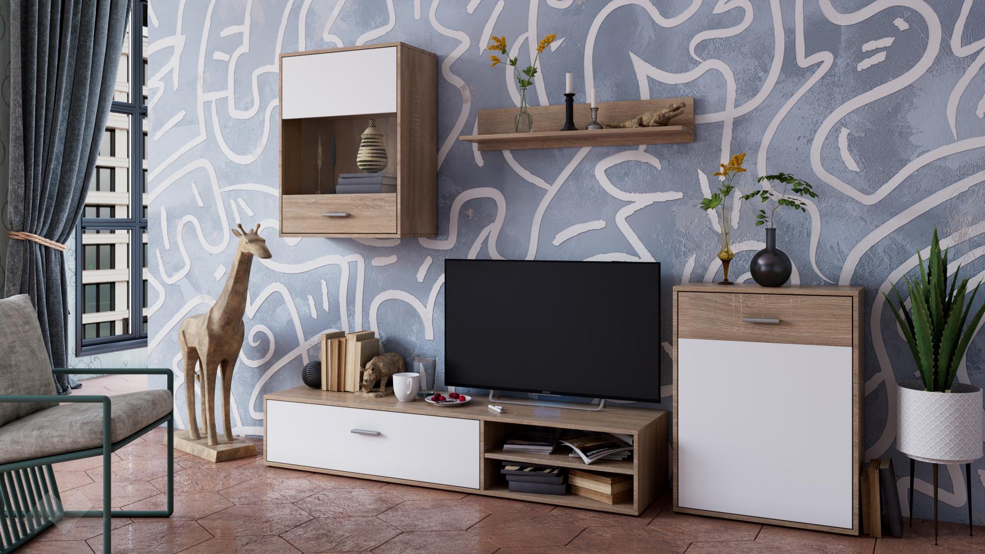 ⭐ Предимства: ✓ модерен дизайн ✓ ТВ шкаф ✓ висок шкаф ✓ окачен шкаф ✓ етажерка ✓ 16 мм ПДЧ