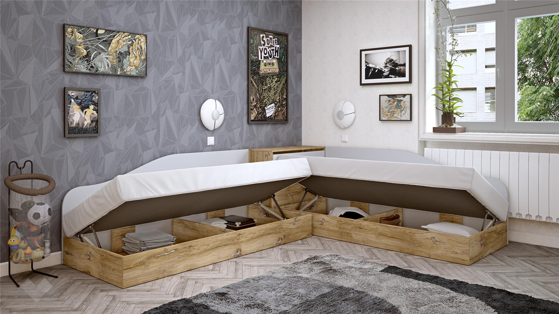 Леглата са проектирани с извита, мека линия на таблата, която едновременно служи като облегалка и предпазва стената. С механизът за повдигане на матрака и раклата ти предоставяме изключително ценно допълнително място за съхранение на спално бельо, играчки, дрехи или други вещи, спомагайки за поддържане на реда в стаята.