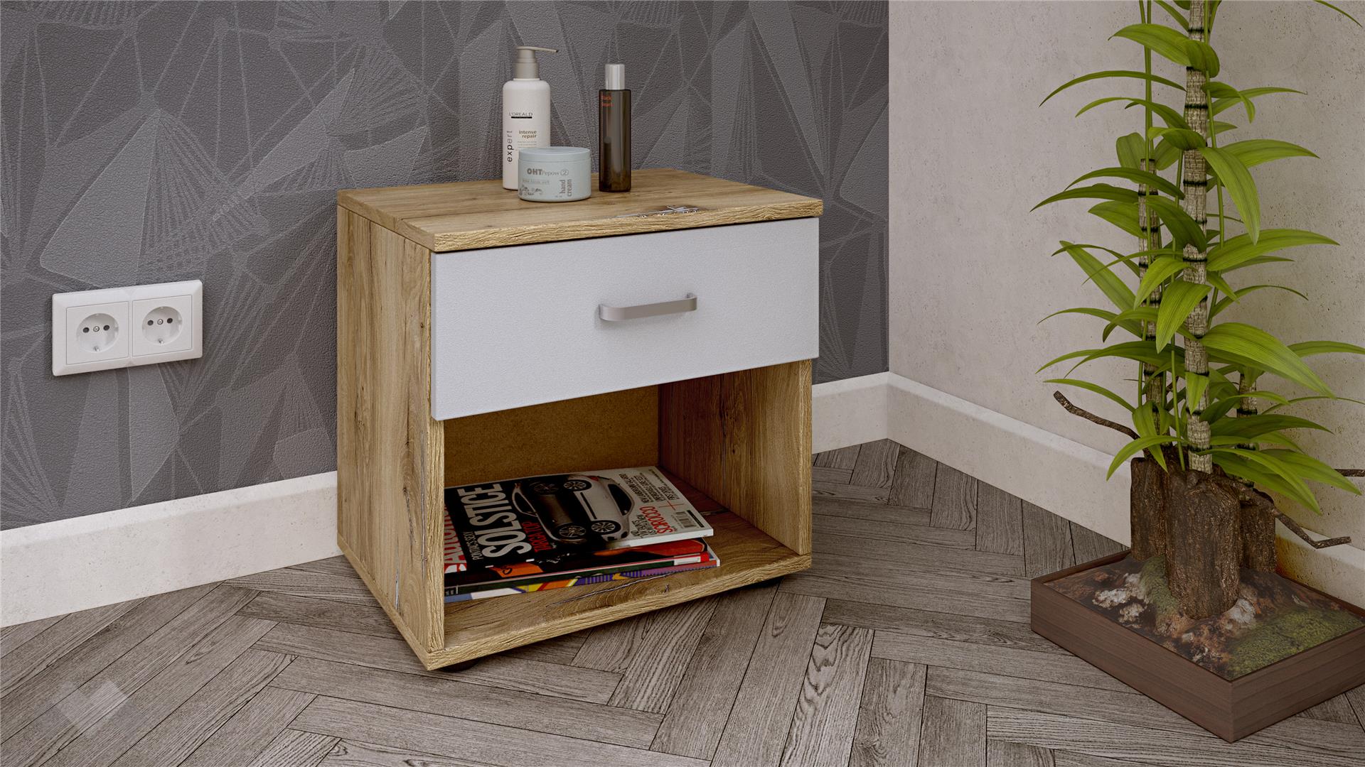 С оптималната си височина, нощният шакф предоставя допълнително удобство към всяко легло - нощна лампа, чаша вода или любима книга преди сън, са на една ръка разстояние от теб. Чекмеджето и отворения рафт ти дават още място за вещи, необходими за спокойния ти сън.
