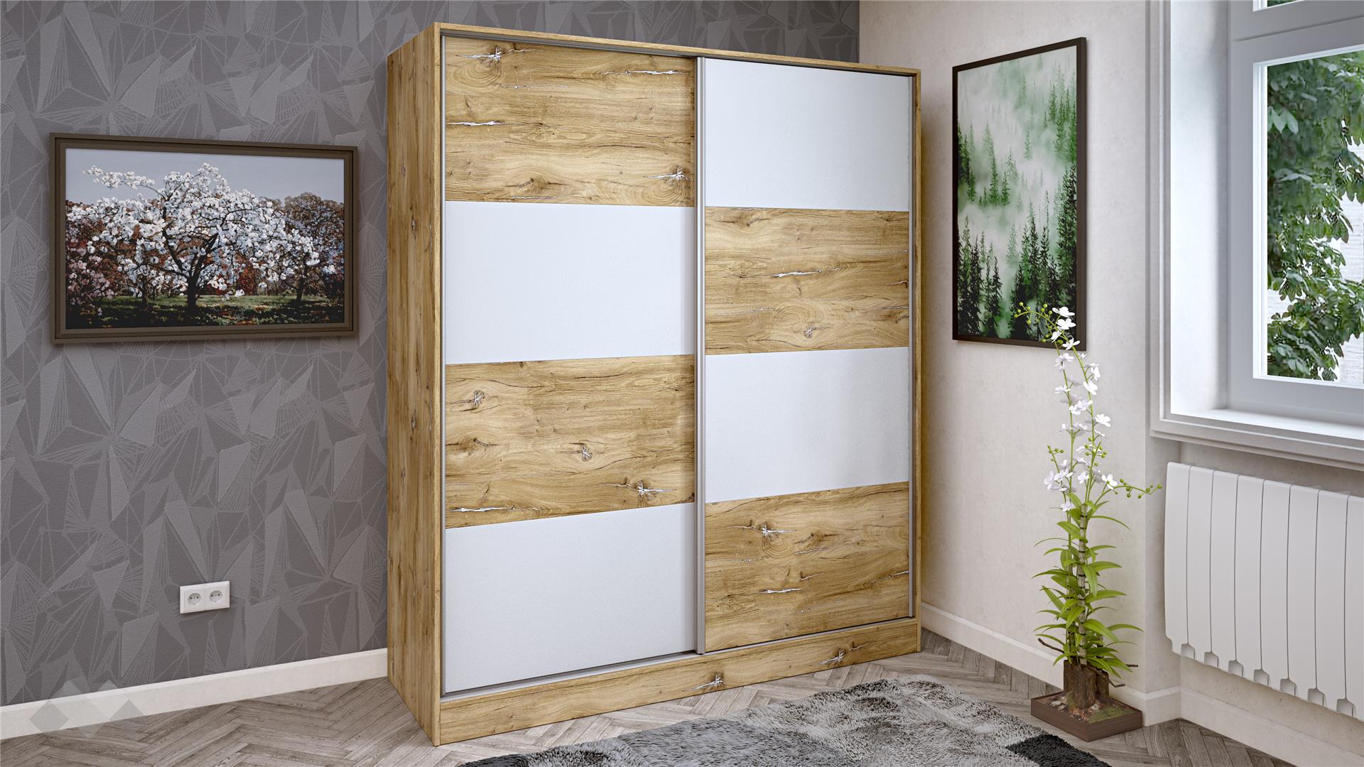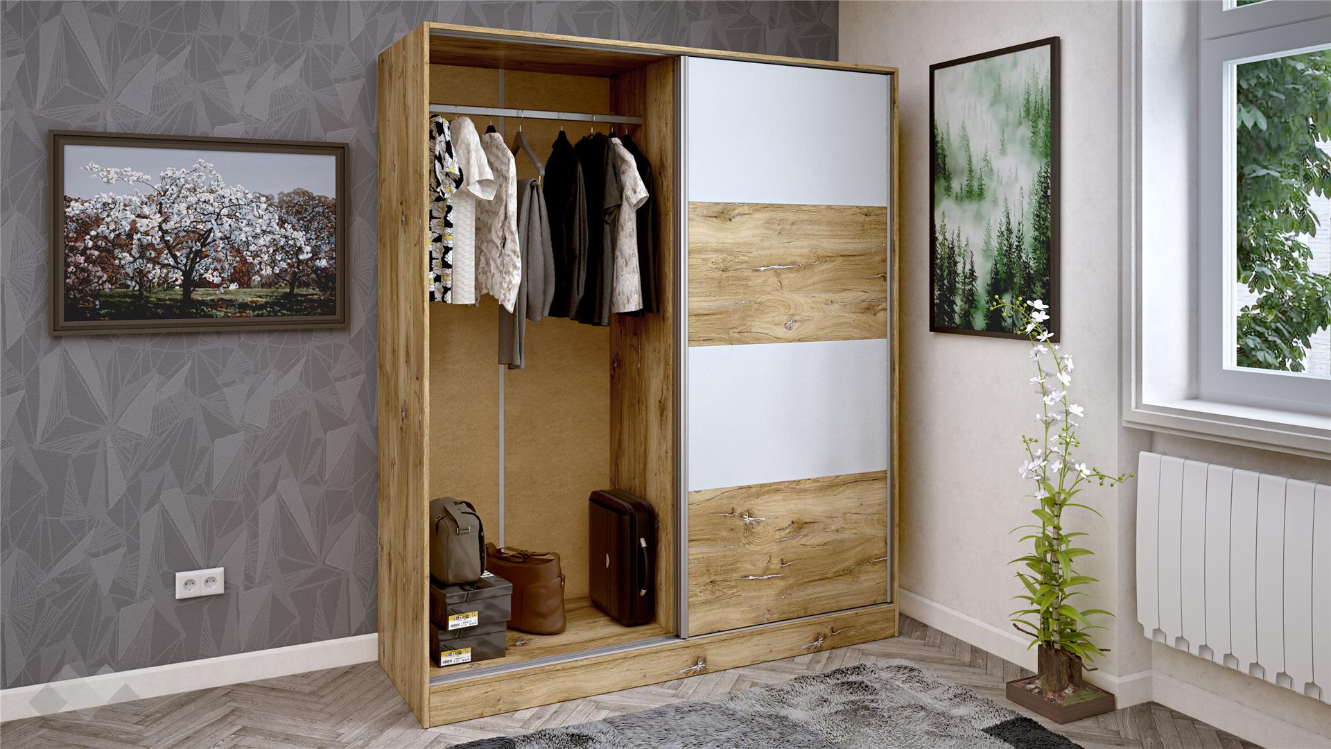 ⭐ Предимства: ✓ 16 мм ПДЧ ✓ с плъзгащи врати ✓ 4 рафта ✓ лост за закачалки ✓модерен дизайн ✓ практично разпределение ✓ качествена изработка