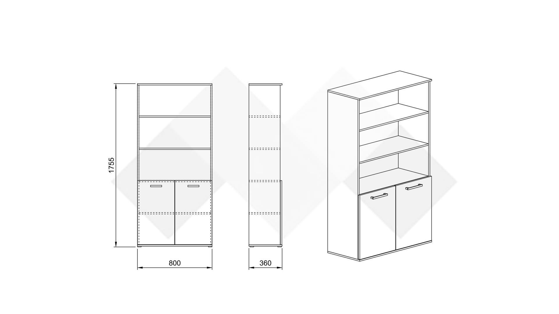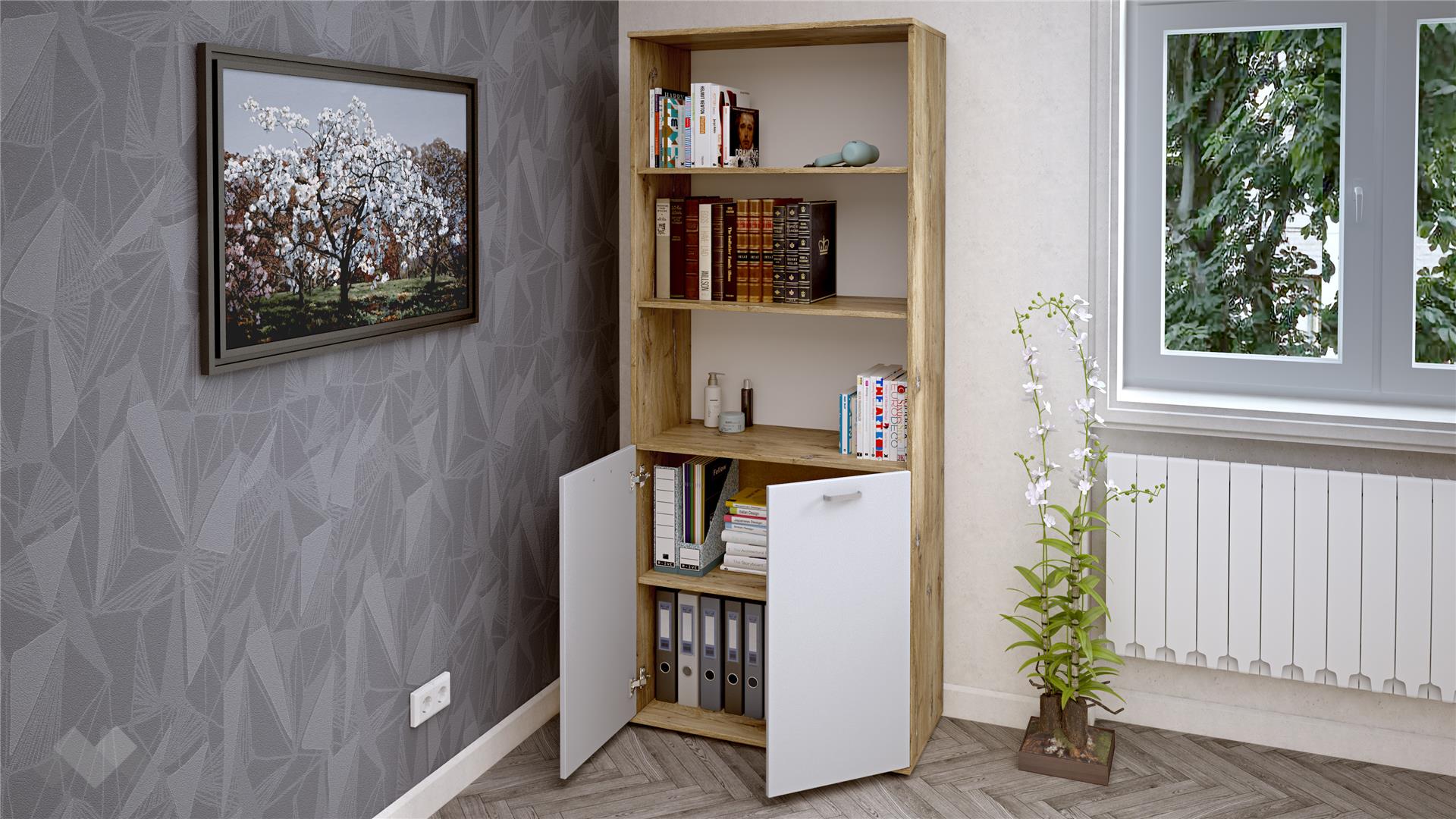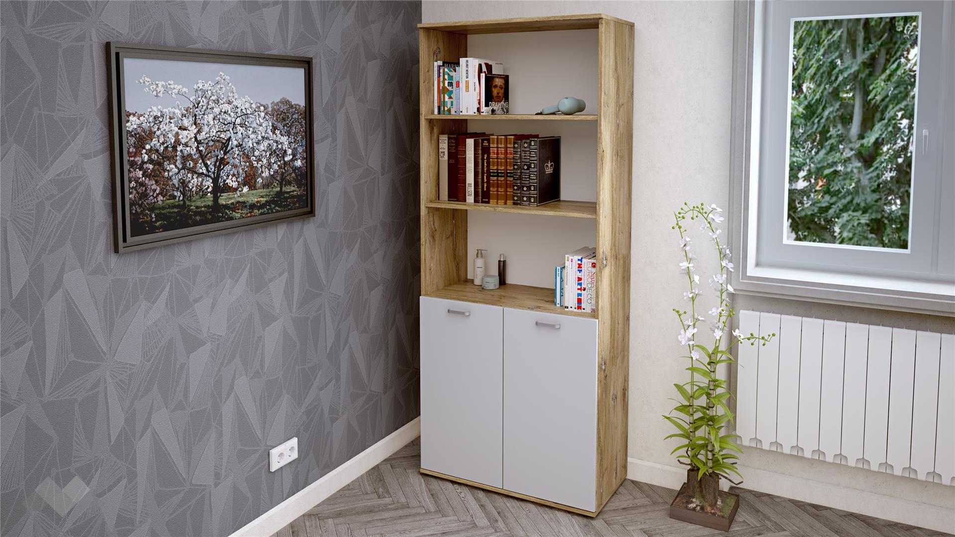 Този висок шкаф е изключително практичен и функционален – благодарение на него разполагаш с голямо място за съхранение, където да ораганизираш помещението, за което си го избрал. Може да подредиш цялата си документация и хаоса да остане в миналото. В долната му част разполагаш с широк шкаф с един рафт и две вратички. На горните два широки рафта може да подредиш папки, класьори или книги, до които да имаш бърз и лесен достъп.