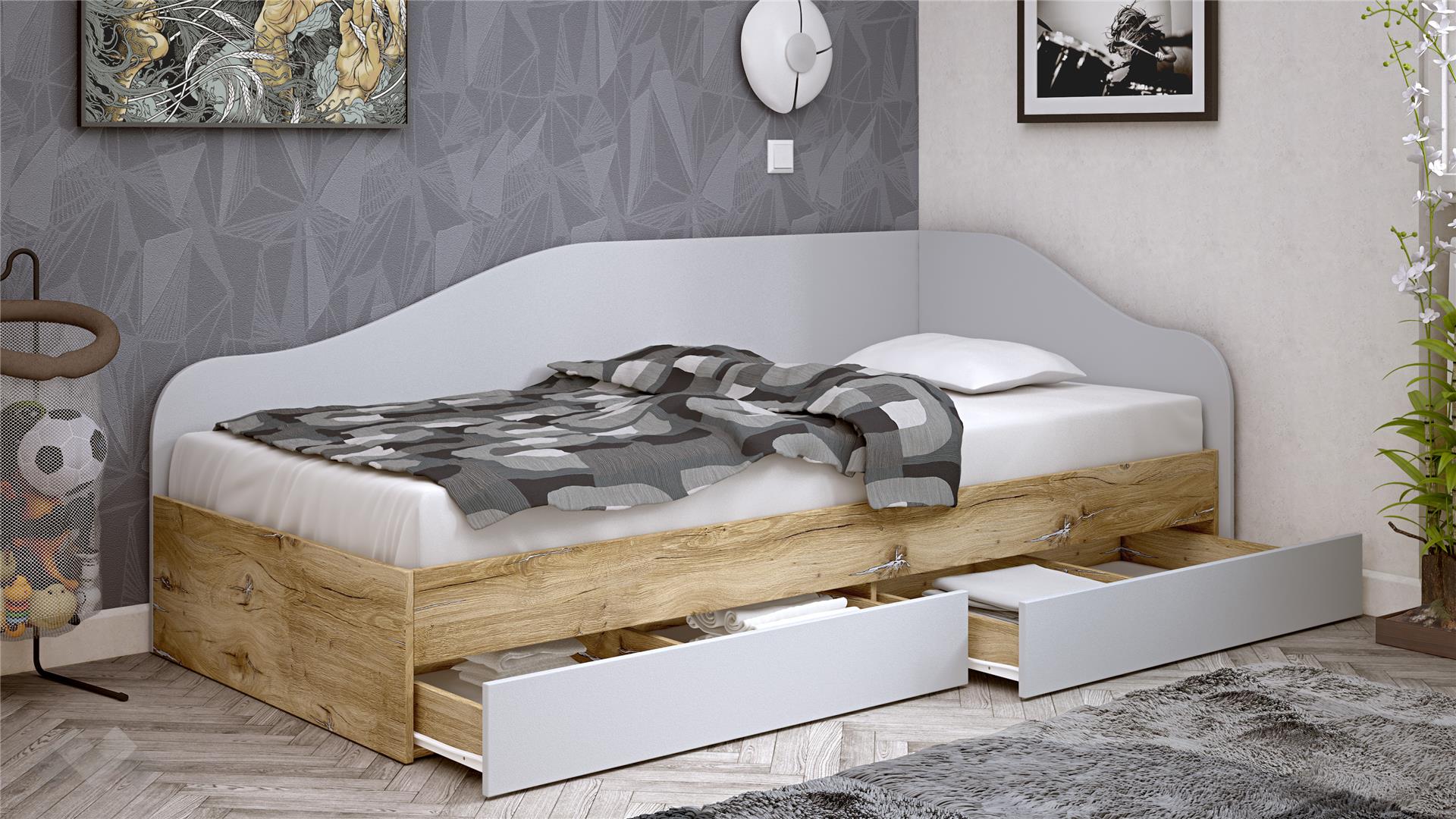 Леглото е проектирано с извита, мека линия на таблата, която едновременно служи като облегалка и предпазва стената. С двете просторни чекмеджета ти предоставяме изключително ценно допълнително място за съхранение на спално бельо, играчки, дрехи или други вещи, спомагайки за поддържане на реда в стаята.