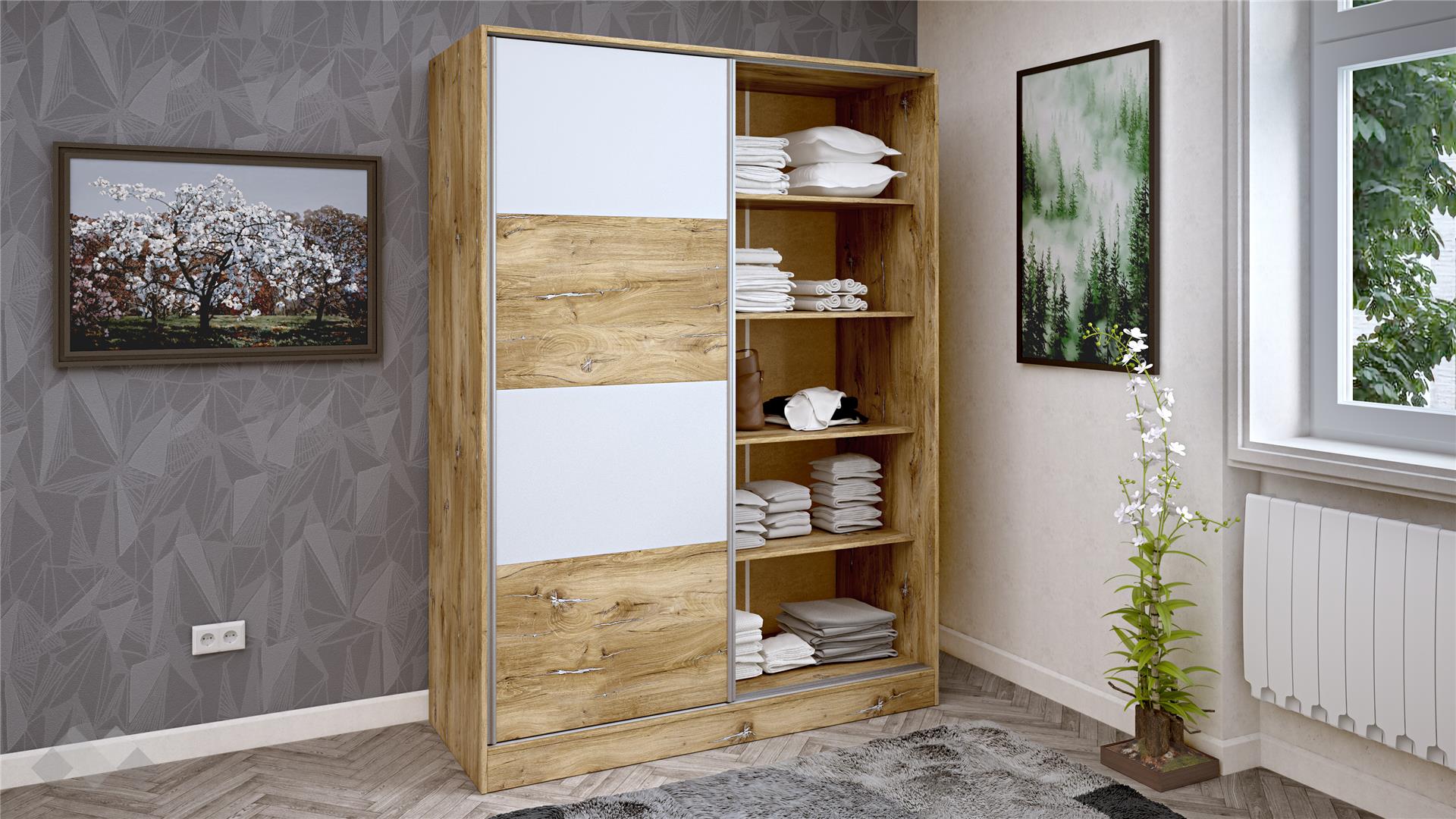 Гардеробът е с компактна форма и ще те впечатли с функционално разпределение, което ще ти позволи да подредиш добре всички дрехи и аксесоари. Лостът за закачалки е подходящо място, където да подредиш палта и по-обемни връхни дрехи или да закачиш всичко, което искаш да бъде готово за обличане, а четирите рафта са удобни за подреждане на сгънати дрехи, обувки и кутии за съхранение.