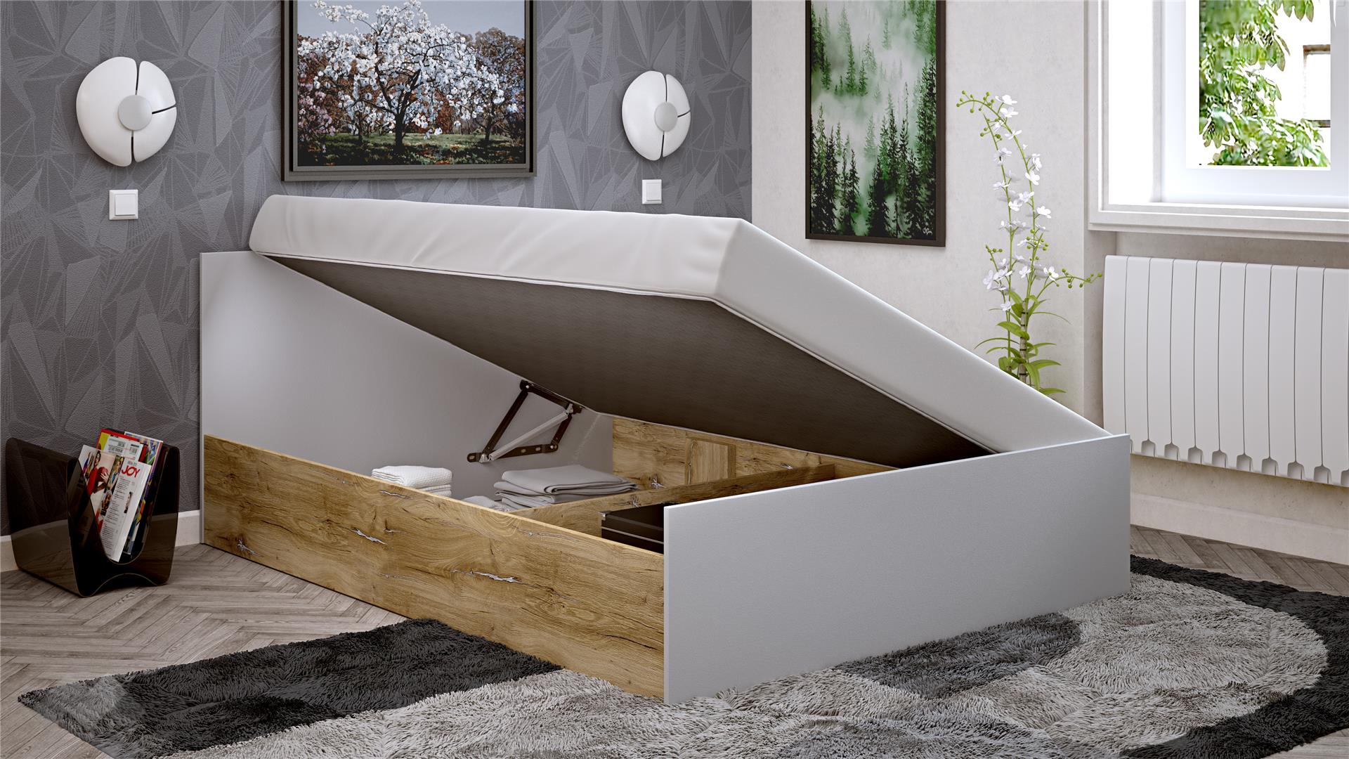 Леглото е подходящо за матрак с размер 140/200 и е проектирано с удобна таблата, която едновременно служи като облегалка и предпазва стената. Включеният механизъм за повдигане на матрака ти позволява да организираш още по-добре пространството и своите вещи, завивки или сезонни дрехи.