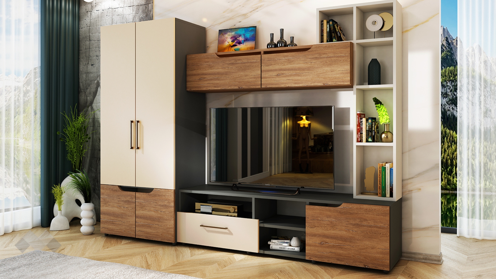 ⭐ Предимства: ✓ модерен декор ✓ голямо и функционално място за съхранение ✓ ТВ шкаф ✓ двукрилен гардероб ✓ 1 чекмедже ✓ открити рафтове ✓ механизъм за плавно затваряне ✓ качествена изработка ✓ 16 мм ПДЧ