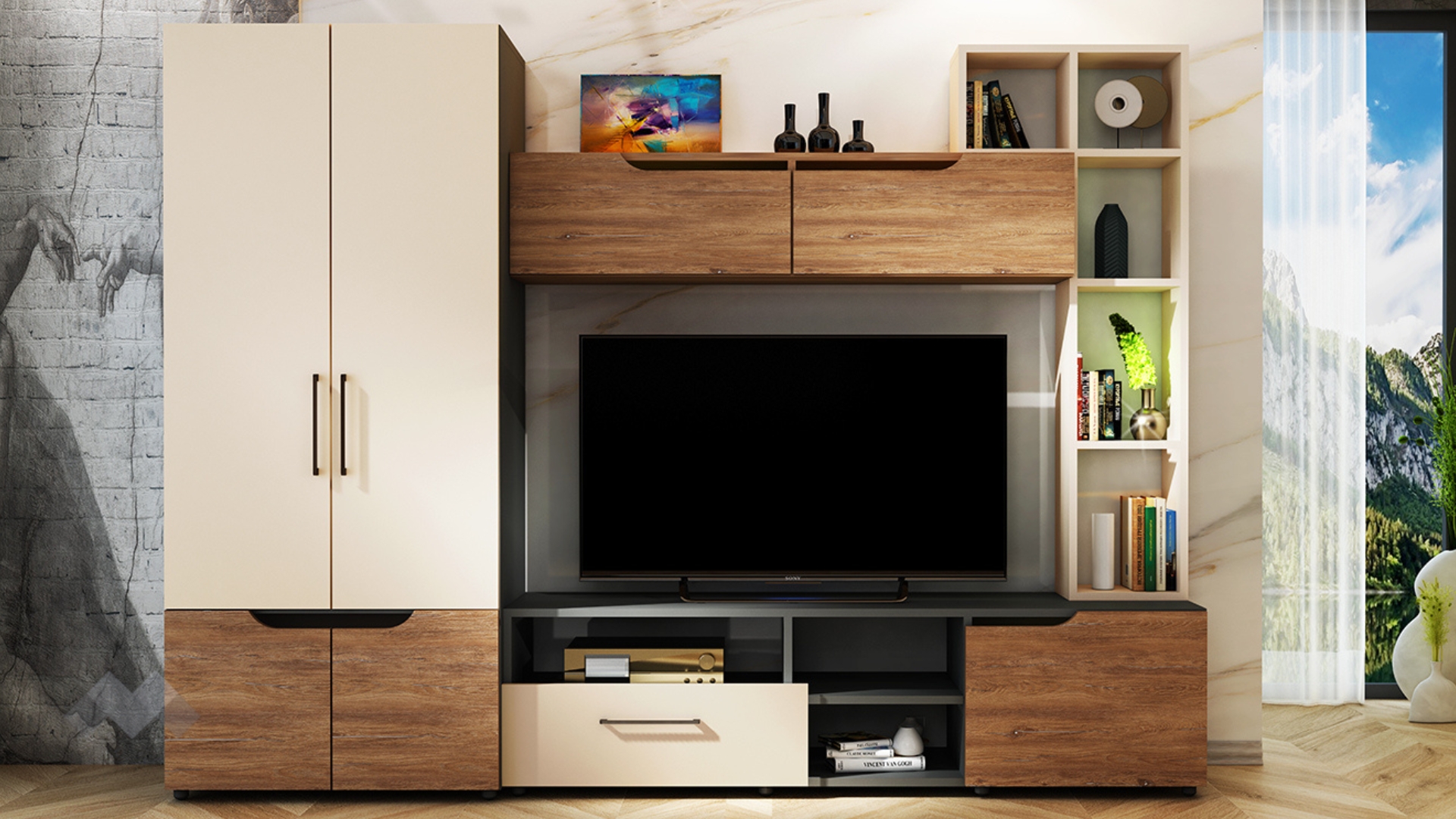 Основата на секцията представлява ТВ шкаф, състоящ се от шкаф с вратичка, отворени ниши, чекмедже и плот. Там можеш да поставиш цялата си съпътстваща техника като ТВ приемници, DVD плейъри или друга техника. Над мястото за телевизор са позиционирани шкафове, където да организираш още полезни за ежедневието вещи. Откритите рафтове са идеални за подреждане на книги, скъпи спомени като фотографии, любими сувенири или други декорации. Двукрилният гардероб разполага с лост за закачалки и два рафта, които ще ти предоставят достатъчно място за дрехи, спално бельо, възглавници и кутии за съхранение.