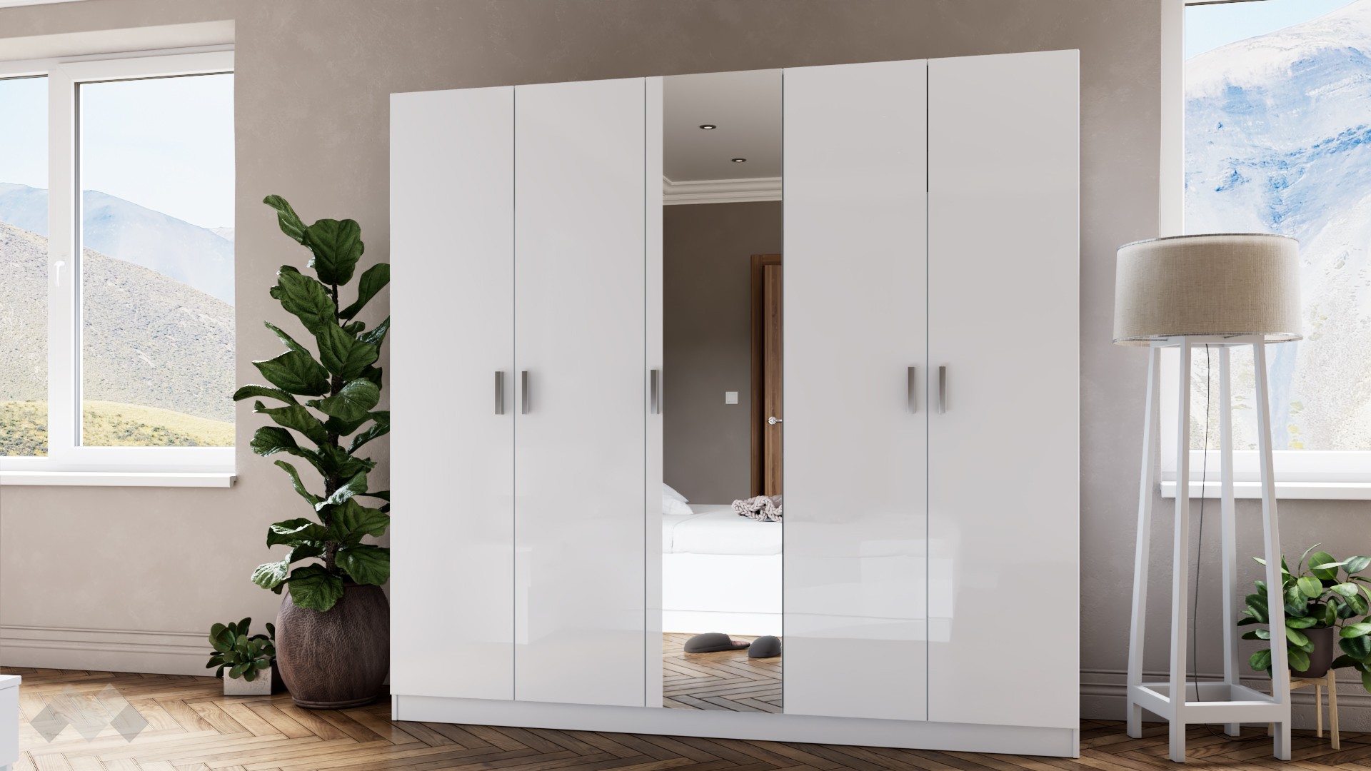 Гардеробът е петкрилен, с практично разпределение, което ти позволява да подредиш добре всички вещи. На твое разположение са общо 12 рафта и 2 лоста за закачалки. Можеш да използваш рафтовете за организиране на завивки, сгънати дрехи, бельо, аксесоари, кутии за съхранение или други необходими за теб неща. Лостовете за закачалки са подходящи за елегантното облекло, което се мачка лесно. Ще ти допадне и огледалото, разположено на една от вратите – то превръща гардероба в незаменим помощник при избора на тоалет.