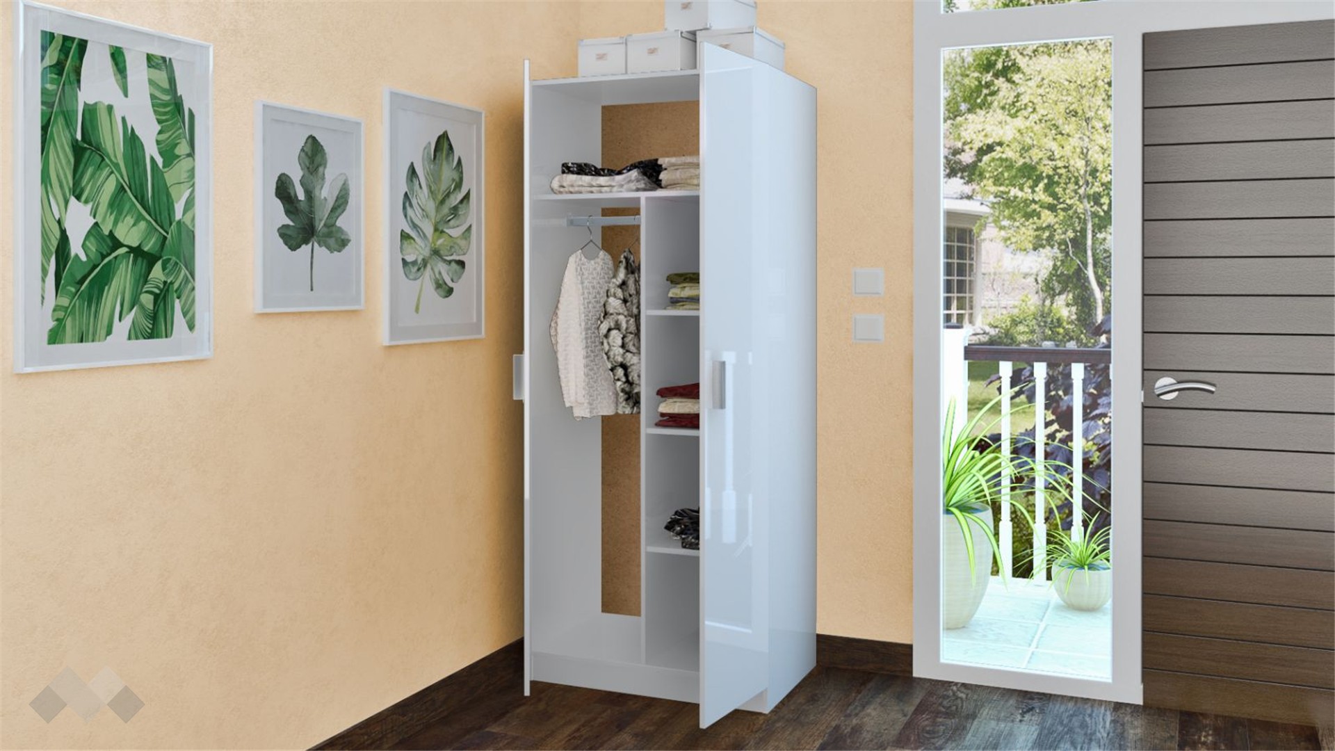 ⭐ Предимства: ✓ двукрилен ✓ 4 рафта ✓ лост за закачалки ✓ механизъм за плавно затваряне ✓ модерен декор ✓ практично разпределение ✓ качествена изработка ✓ 16 мм ПДЧ