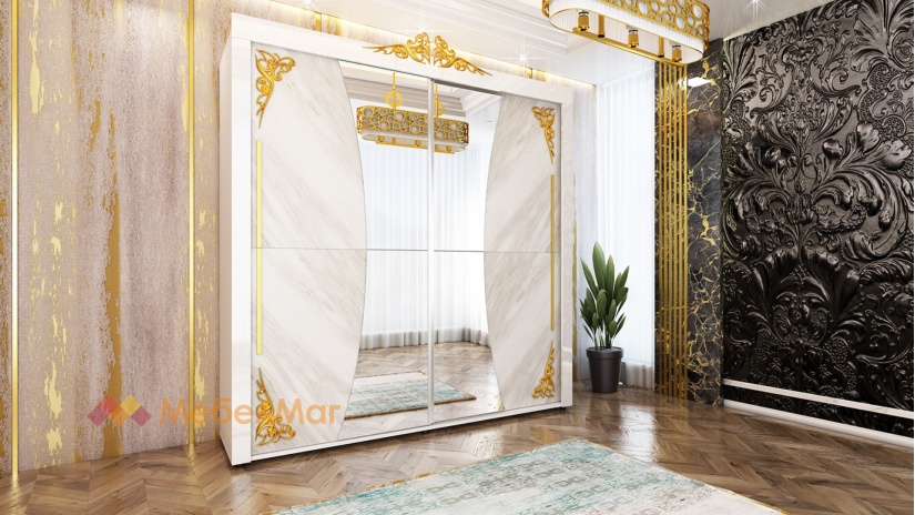Гардеробът изглежда величествен, благодарение на просторния си дизайн и функционалното разпределение. Той ще ти осигури достатъчно пространство за всички твои дрехи и аксесоари. Нощните шкафчета са удобни и в същото време пищни. Разполагат със златни орнаменти, лайсни и крачета от бял гланц. Плота върху тях е идеалното място за кокетна нощна лампа, любима книга или мобилния телефон. За допълнително удобство може да добави механизми за плавно затваряне на вратите му.