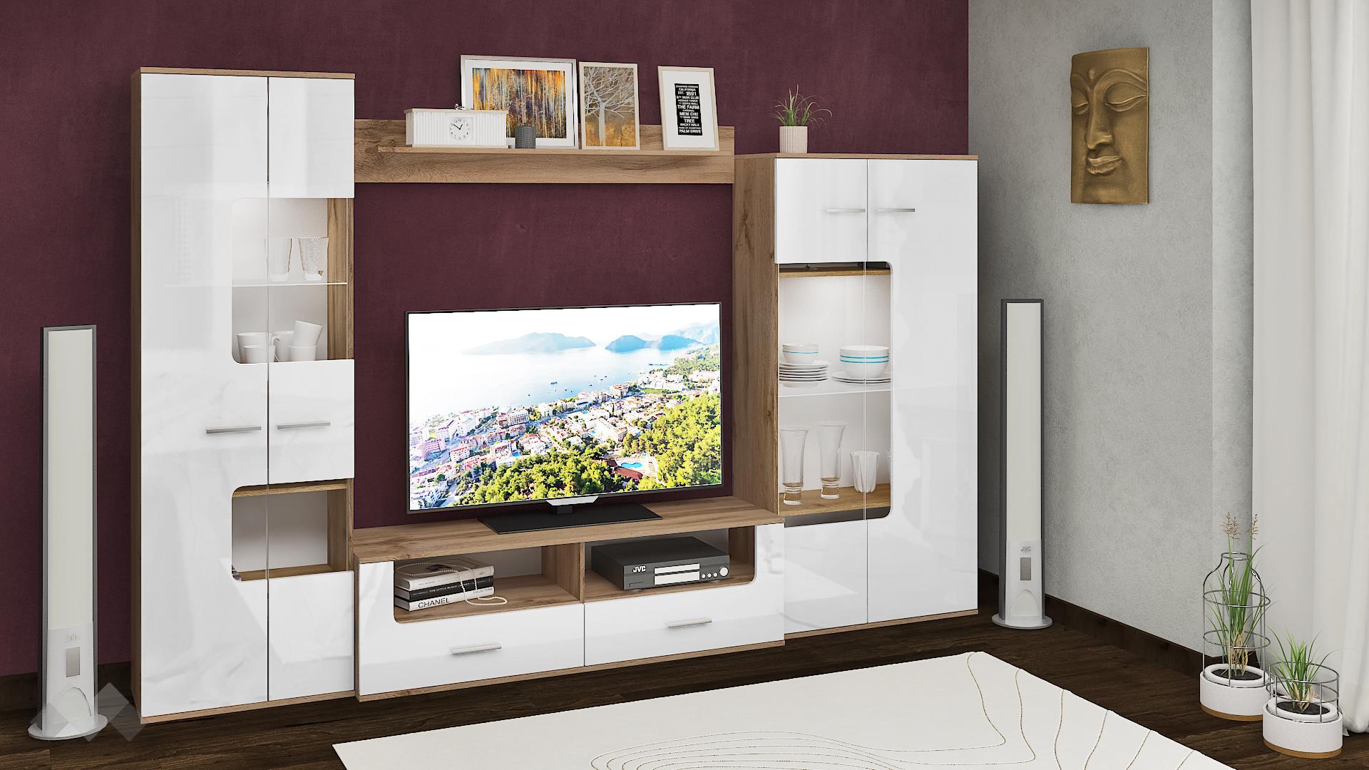 Модерна, стилна, блестяща - секция Шери ще те впечатли. Тя е снабдена с ТВ шкаф с две чекмеджета и две отворени ниши за допълнителни устройства, декодери и др. Две изящни стъклени витрини за красиви съдове и украси, които не би искал да останат скрити от погледите на твоите гости, и горен рафт за любимите ти книги и фотографии.