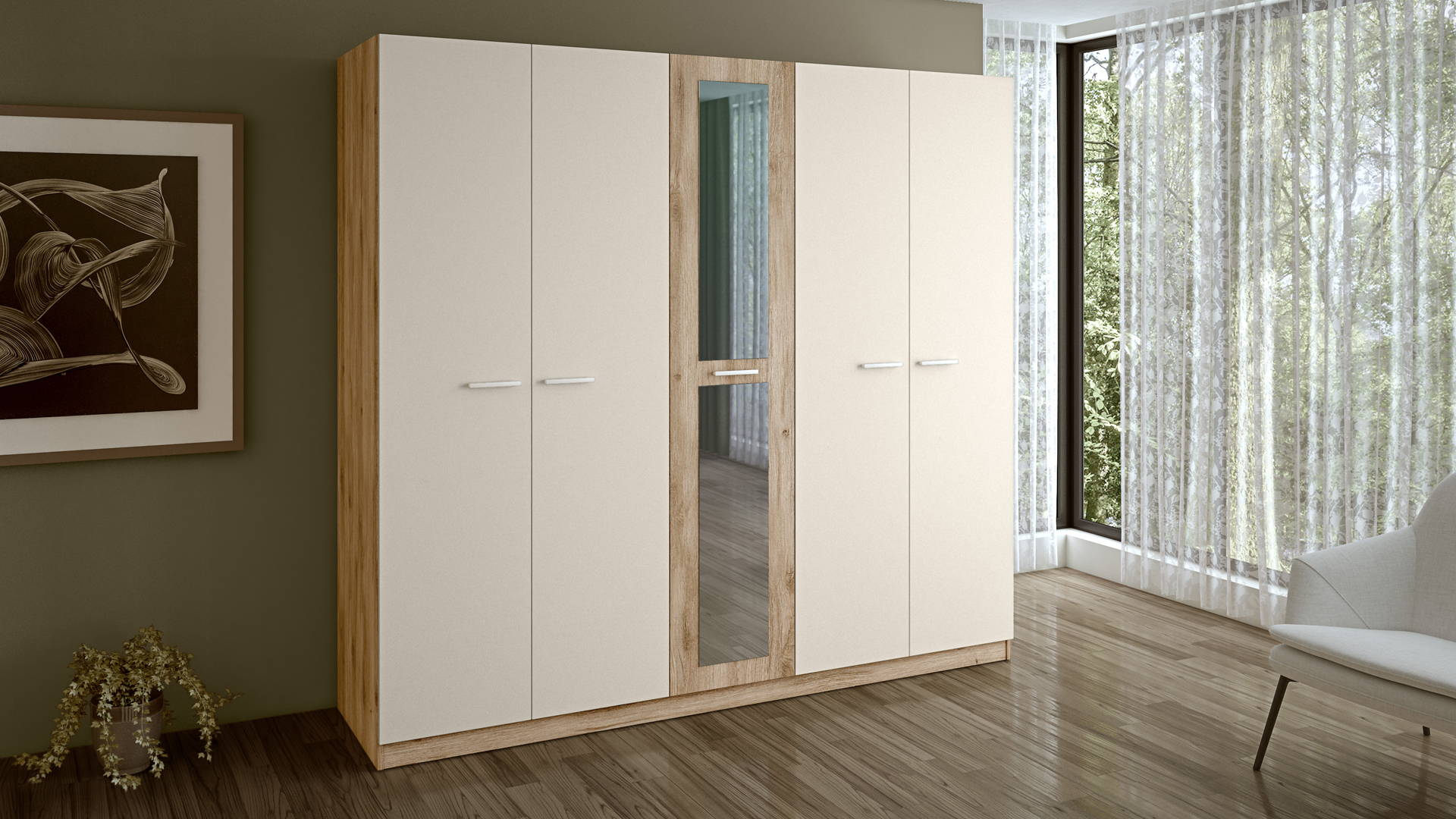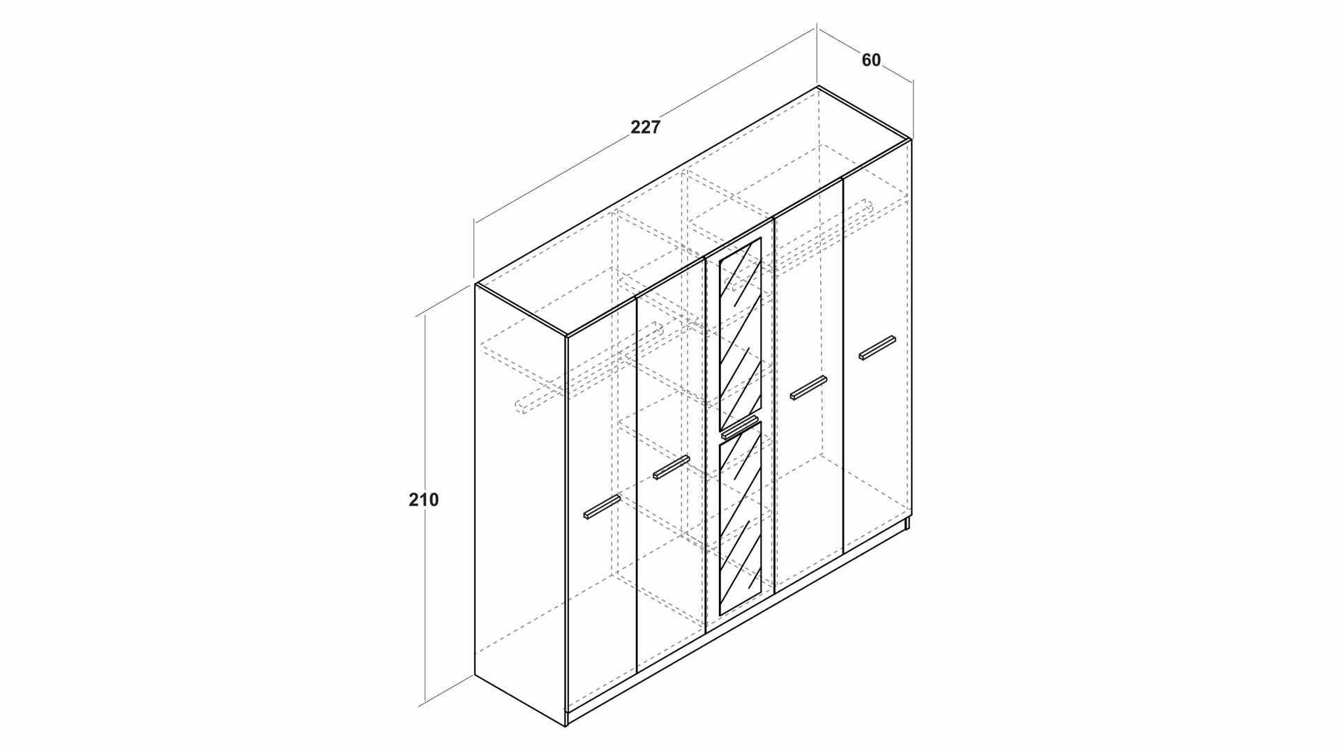 Средното крило е оборудвано с две огледала, което не само е изключително практично за обличане, но и оптически разширява пространството в стаята, придавайки усещане за светлина и простор. Всяко крило е с дискретни и елегантни хоризонтални дръжки, които допълват минималистичния дизайн и осигуряват лесно отваряне. Вътрешното разпределение на гардероба включва комбинация от рафтове зад средната врата и лостове за закачалки зад останалите врати, позволявайки оптимално организиране на Вашите вещи.