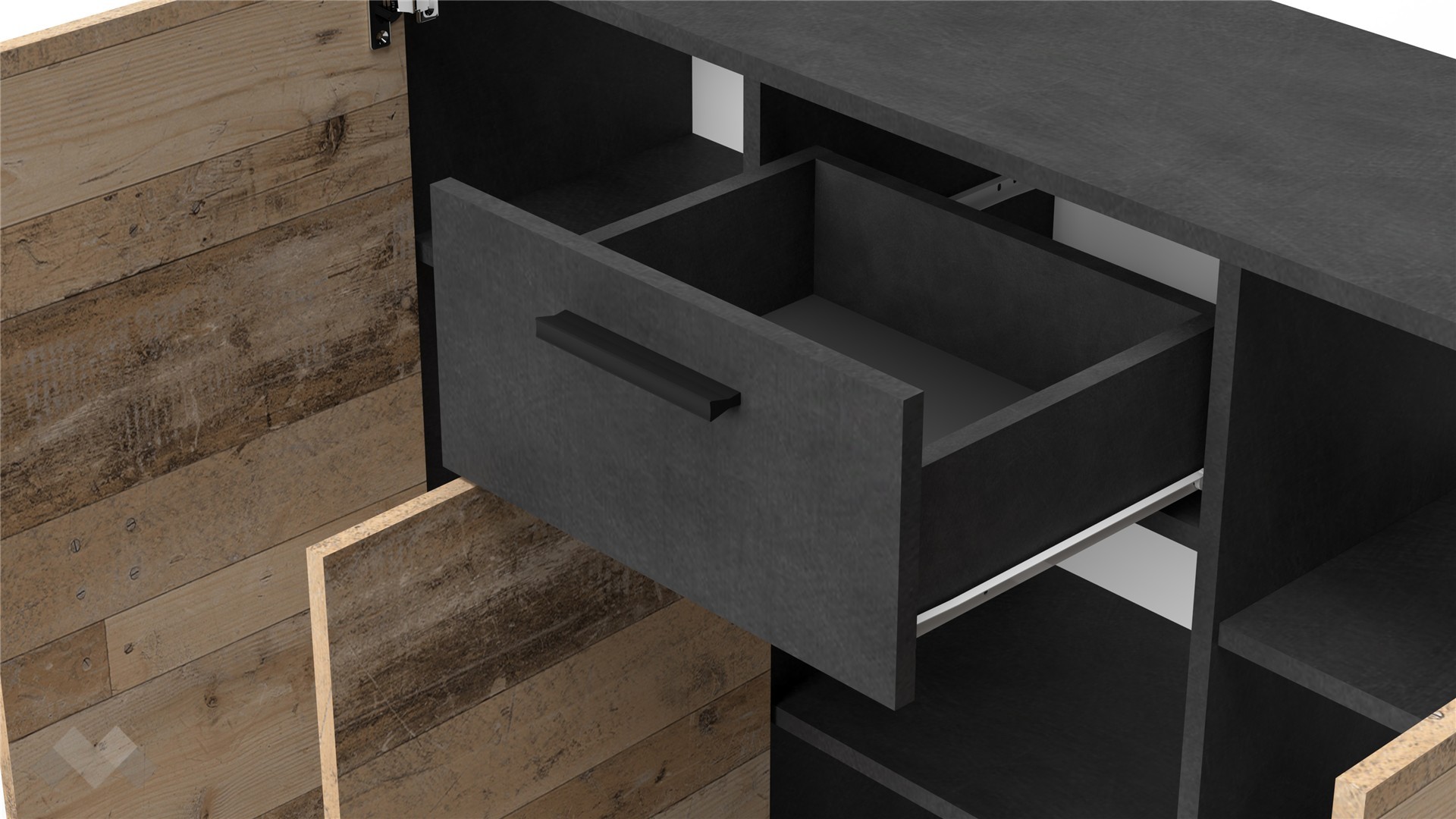 На твое разположение са чекмедже, затворен шкаф с един рафт и два затворени шкафа с по два рафта. Моделът е универсален и ще намери приложение във всяка стая. Можеш да го поставиш в спалнята, където да ти предостави допълнително място за дрехи и бельо, а върху горния плот може да подредиш козметика, аксесоари или ефектна декорация. Скринът може да бъде и чудесно допълнение към всекидневната, където да ти послужи за организиране на всички вещи, за които не намираш място в секцията. Ако имаш нужда от допълнително място за обувки и аксесоари, можеш да го поставиш и в антрето.