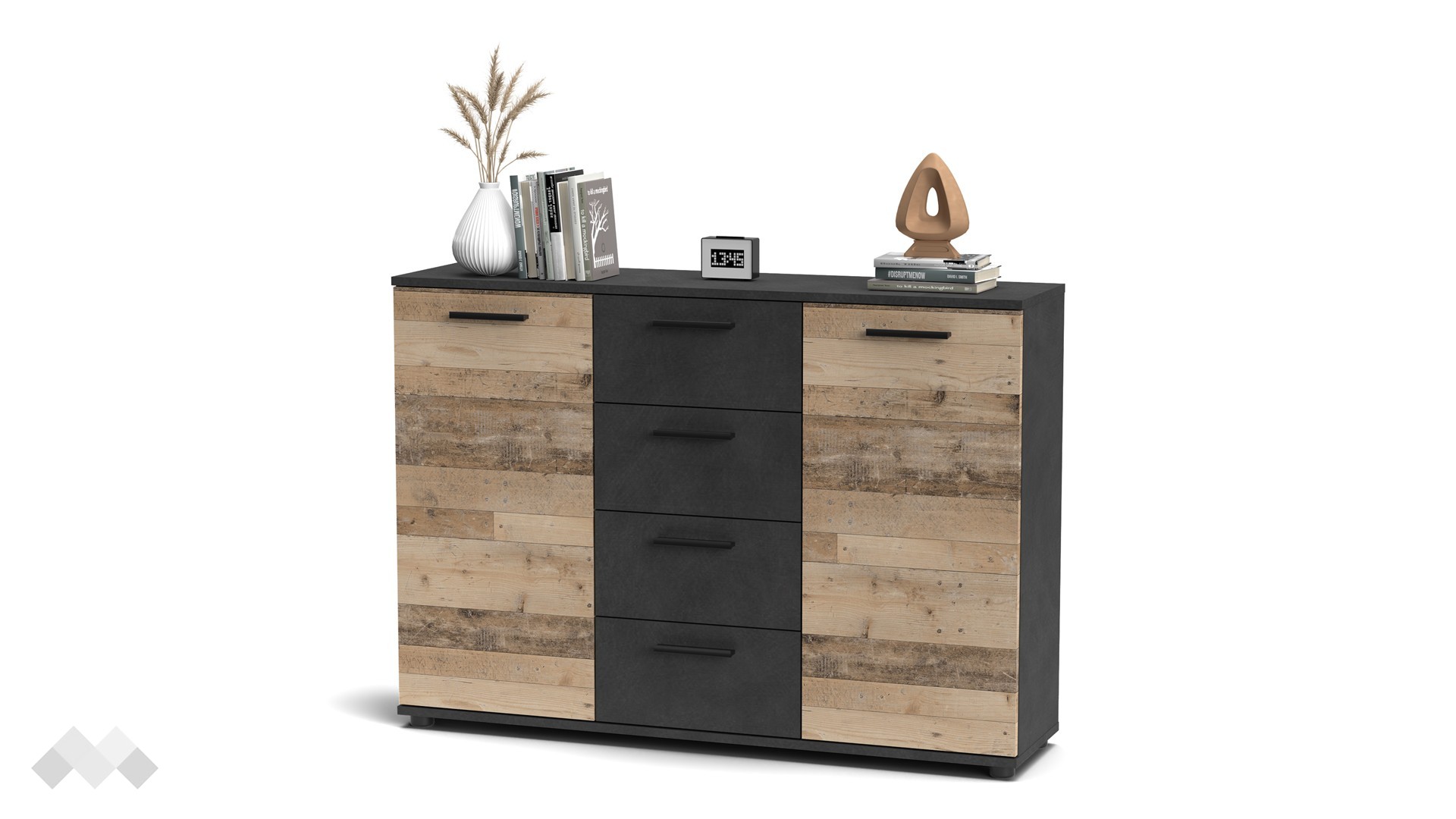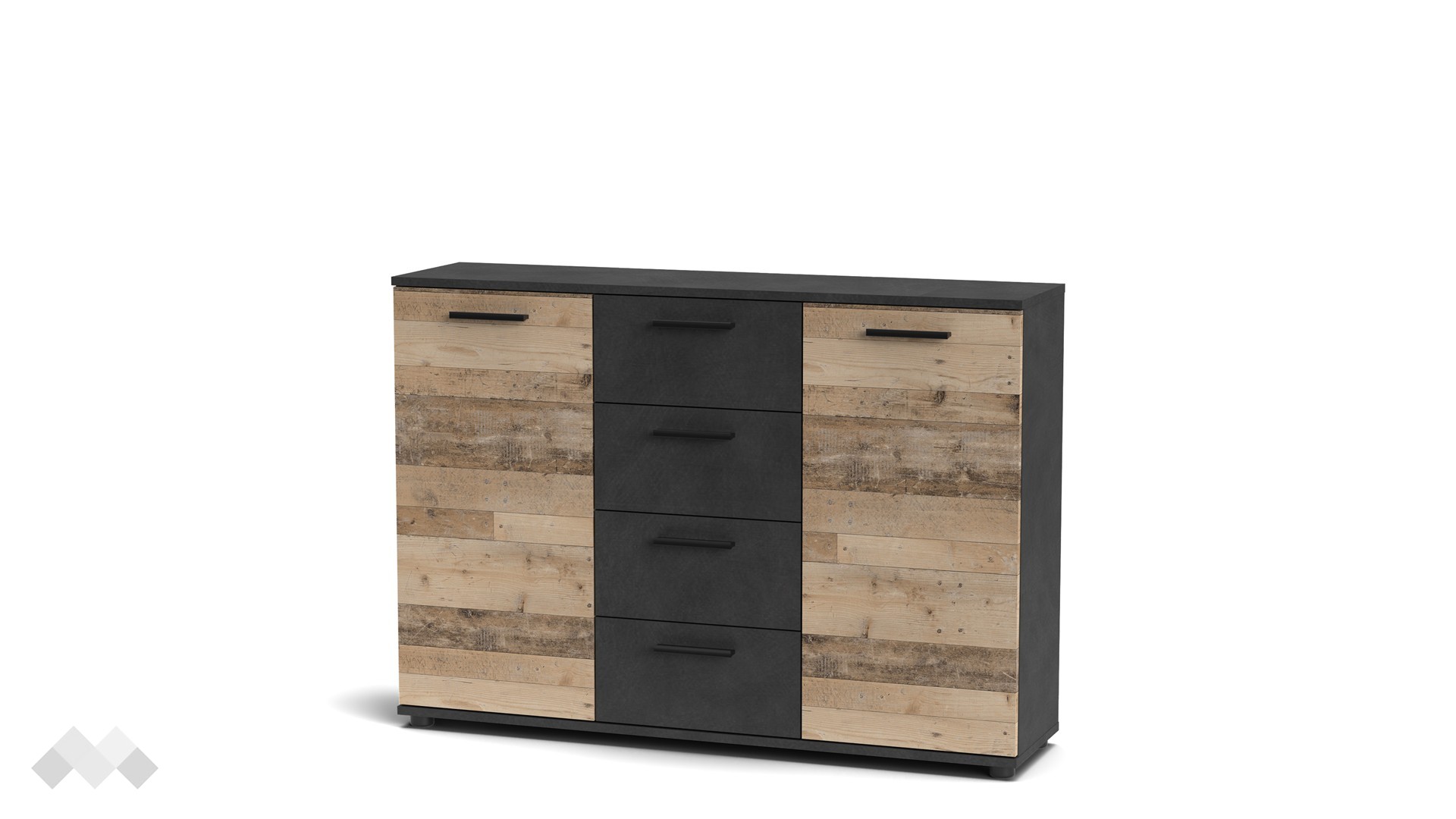 На твое разположение са четири чекмеджета, подходящи за бельо, чорапи или малки ел. уреди. Зад вратите на двата затворени шкафа се крият по два рафта, където можеш да организираш сгънати дрехи, аксесоари или други необходими за теб неща. Горният плот е идеален за подреждане на декорации, книги, козметика, бижута или други вещи, които искаш да ти бъдат винаги под ръка.