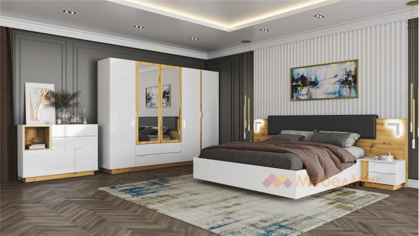 ✓ спалня за матрак 180/200 с тапицирана табла ✓ LED осветление ✓ повдигащ механизъм ✓ петкрилен гардероб ✓ скрин с 2 шкафа и 2 чекмеджета ✓ 2 нощни шкафчета ✓ стилен и модерен дизайн ✓ качествена изработка ✓ 16 мм ПДЧ