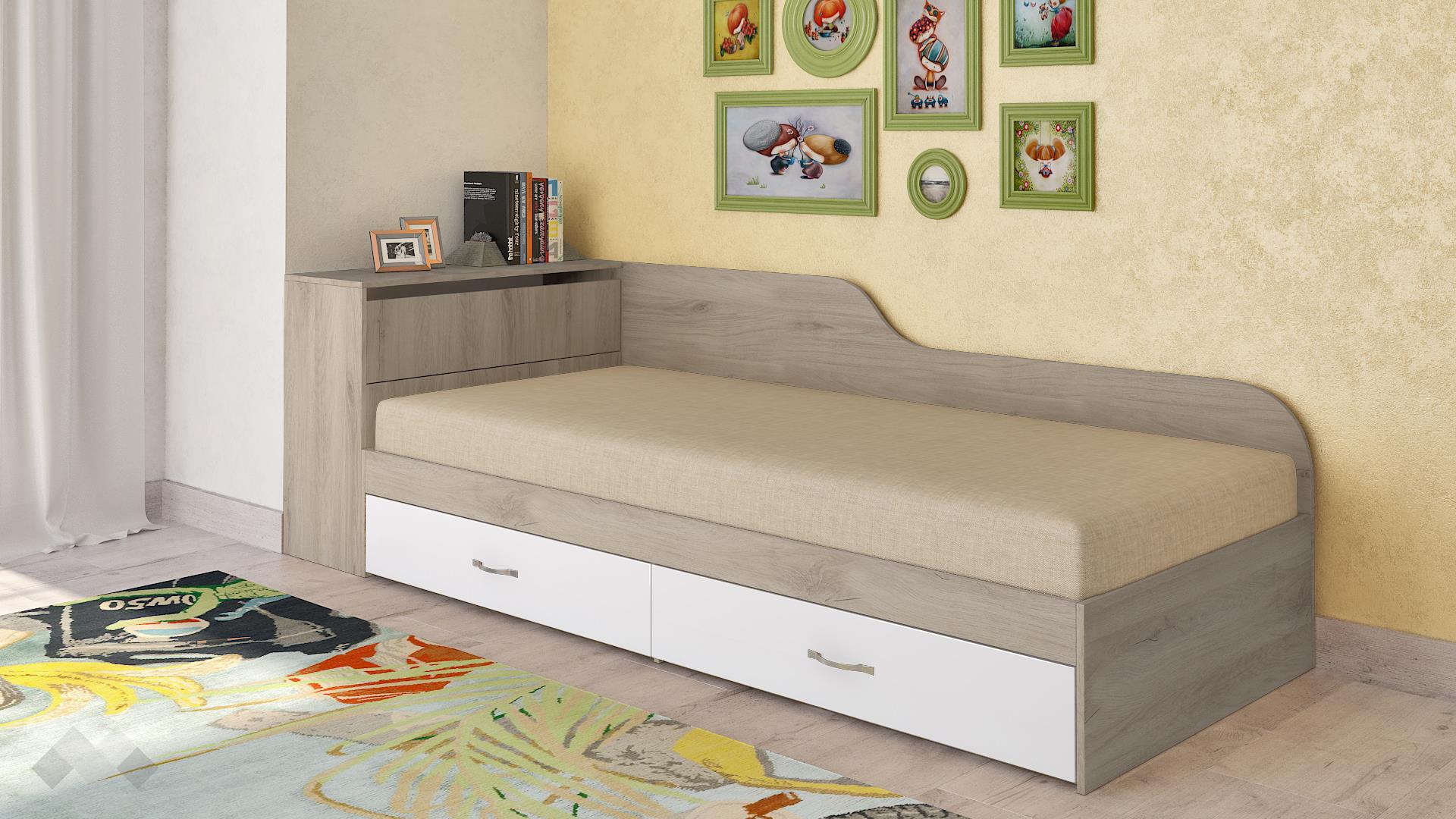 Мини пристата е за матрак с размер 82/190 см – достатъчно просторна, за да ти предостави необходимия комфорт за сън. Тя разполага с 2 чекмеджета и ракла. Така имаш допълнително място за съхранение за спално бельо, дрехи, завивки и други вещи. Така пестиш място и средства, като не е необходимо да купуваш допълнителни скринове или шкафове. Благодарение на това, ще имаш и повече свободно място в стаята.