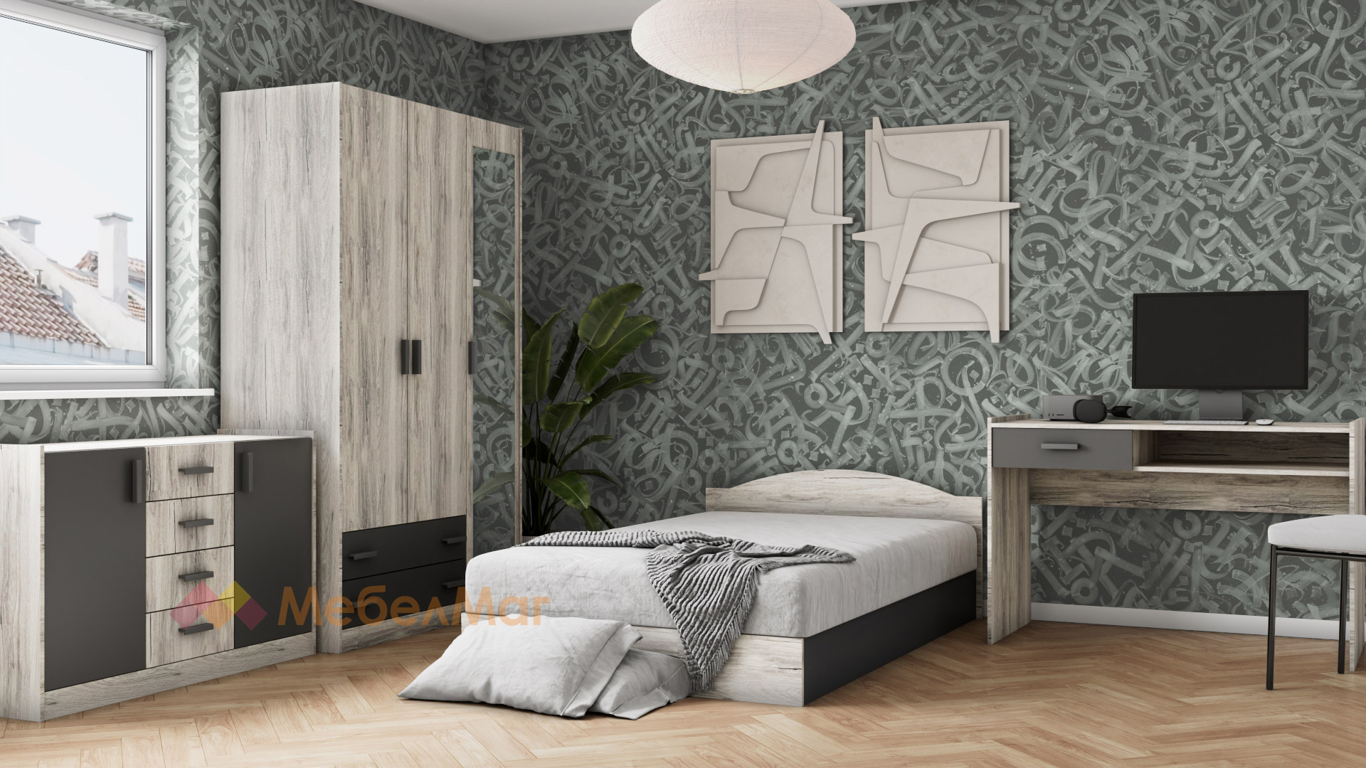 ✓ легло ✓ трикрилен гардероб ✓ лост за закачалки ✓ скрин с 4 чекмеджета и 2 врати  ✓ бюро ✓ семпъл дизайн ✓ повдигащ механизъм ✓ модерен винтидж декор с WNR структура ✓ качествена изработка ✓ 16 мм ПДЧ