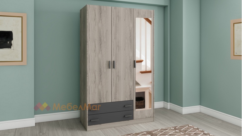 Гардеробът е трикрилен, с 5 обемни рафта, лост за закачалки и две чекмеджета. Практичното разпределение ти позволява да подредиш добре всички дрехи и аксесоари. Можеш да използваш рафтовете за съхранение на сгънати дрехи, обемни пуловери, завивки или други вещи, на лоста да закачиш всичко, което искаш да бъде готово за обличане, а в чекмеджетата да организираш бельо или аксесоари.