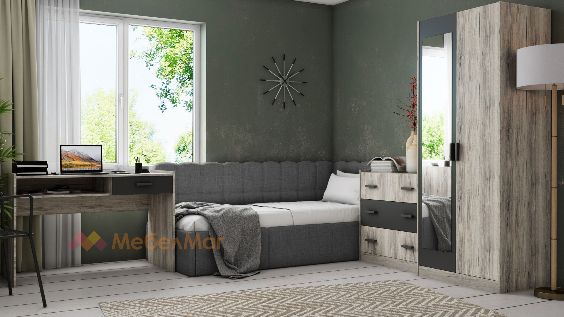 ✓ легло с тапицирана табла и основа ✓ двукрилен гардероб ✓ лост за закачалки ✓ огледало ✓ скрин с 3 чекмеджета ✓ бюро ✓ модерен дизайн ✓ елегантна визия ✓ повдигащ механизъм ✓ качествена изработка