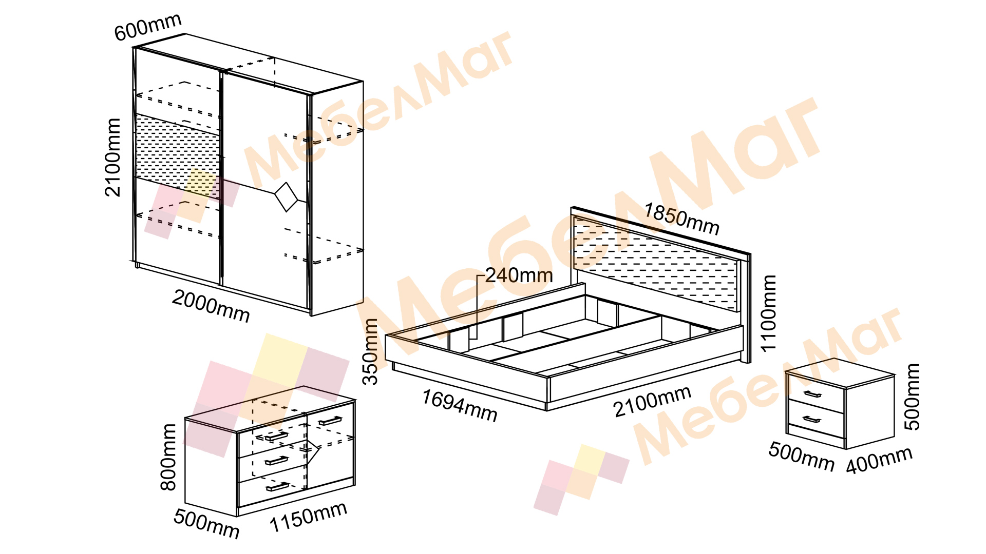 ✓ спалня с нощни шкафчета ✓ гардероб с плъзгащи врати ✓ скрин ✓ механизъм за повдигане на матрака ✓ механизъм за плавно затваряне ✓ качествена изработка от ПДЧ и МДФ ✓ луксозен дизайн ✓ 18 мм ПДЧ и МДФ