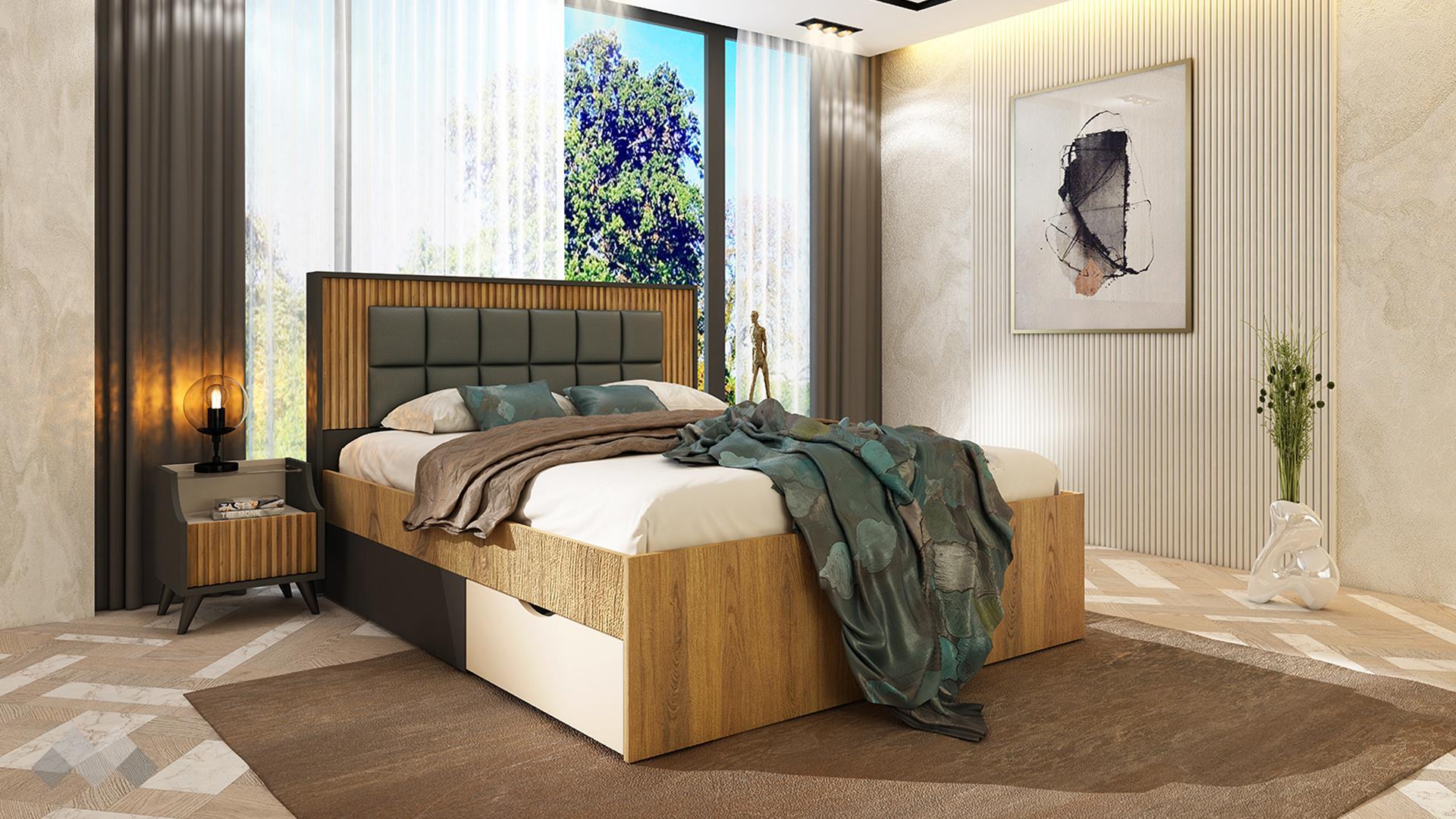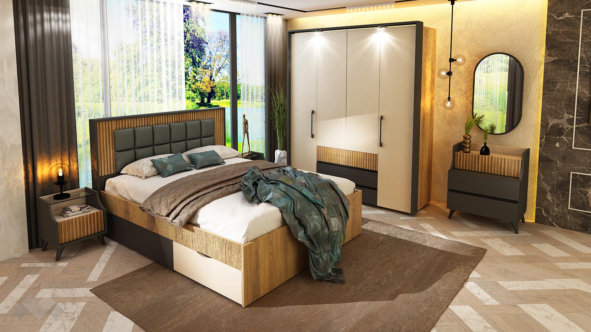 Основният акцент е спалнята, подходяща за матрак 160/200 с висока и тапицирана табла, осигуряваща комфорт при облягане. Текстилната тапицерия в сив цвят подчертава луксозното излъчване на леглото.В основата му са вградени две практични чекмеджета, които предоставят допълнително място за съхранение на спално бельо, одеяла или други вещи.