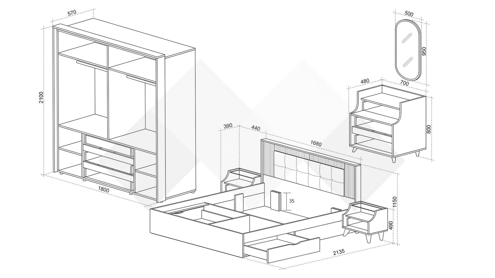 ✓ спалня с 2 чекмеджета ✓ 2 нощни шкафчета ✓ четирикрилен гардероб с 3 чекмеджета и врати “хармоника” ✓ скрин ✓ огледало ✓ механизми за плавно затваряне на вратите ✓ телескопични водачи с пълно изтегляне ✓ LED осветление ✓ модерен декор ✓ качествена изработка ✓ 16 мм ПДЧ и МДФ