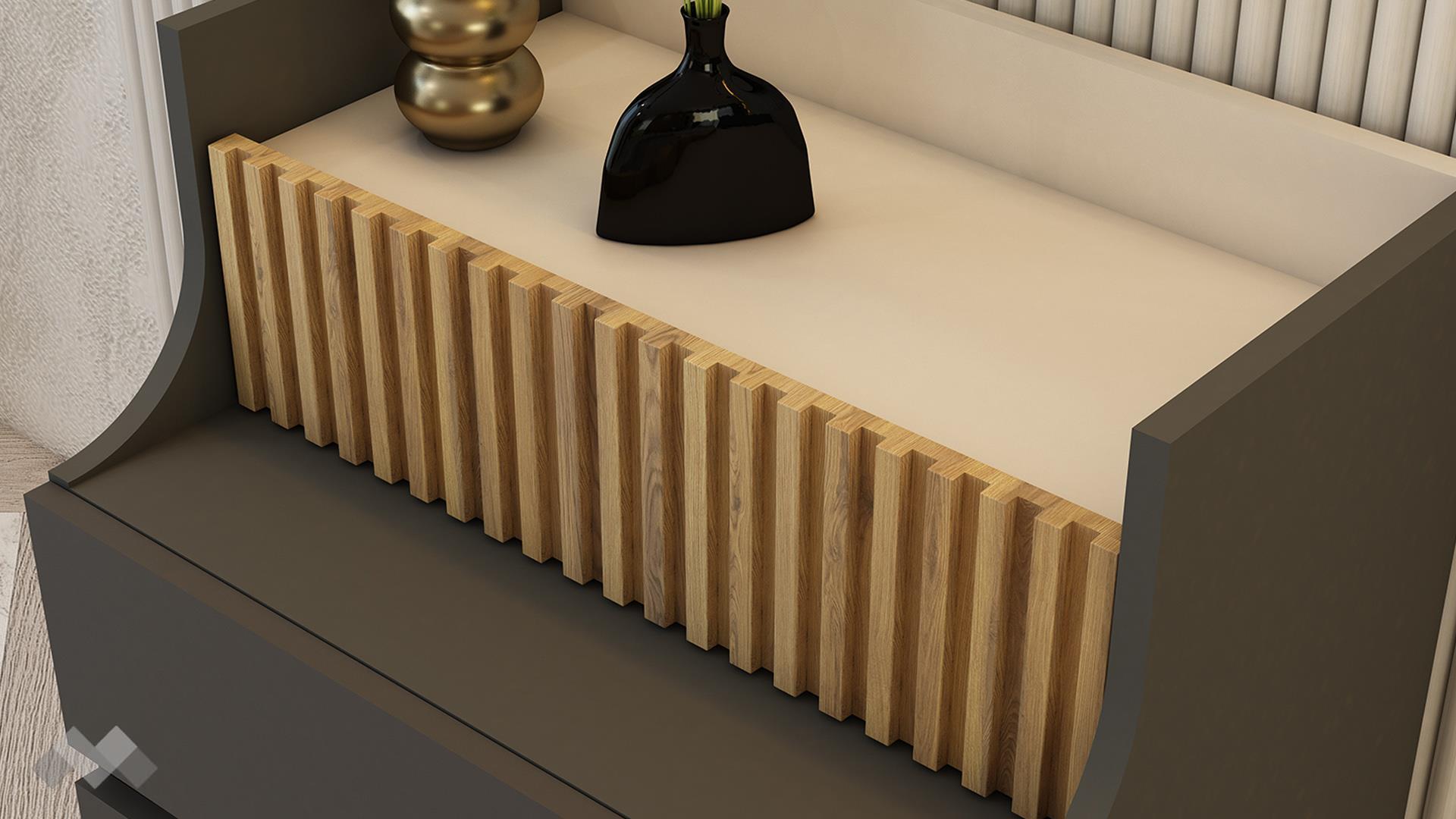 Този впечатляващ спален комплект съчетава стил, комфорт и функционалност в едно цялостно интериорно решение. Изпълнен в модерна комбинация от графит, дъб евок и фронт кашмир, той създава усещане за изтънченост, топлина и уют.