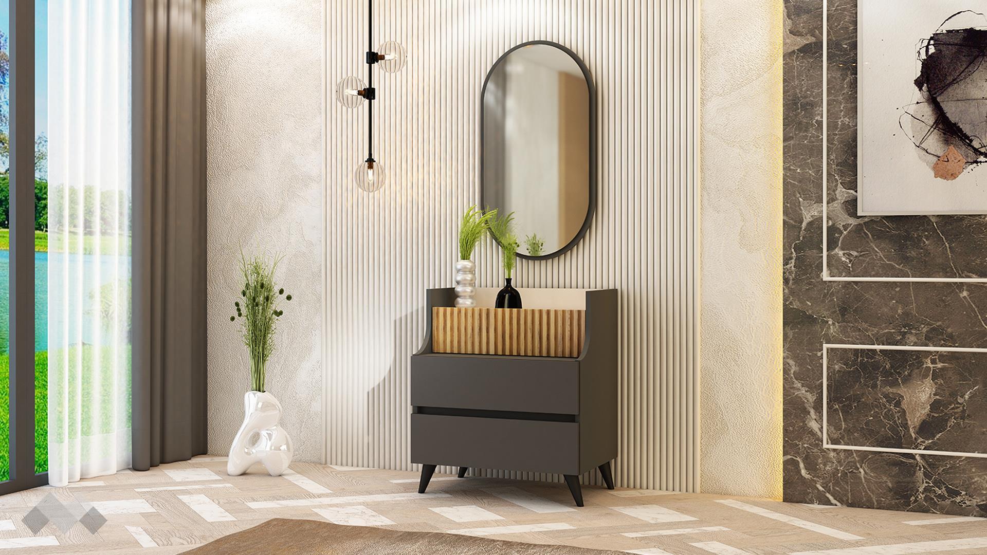 Скринът с три чекмеджета и огледало е не само практично, но и стилно допълнение към комплекта. Предоставя достатъчно място за козметика, аксесоари и бельо, докато огледалото добавя светлина и дълбочина в пространството.