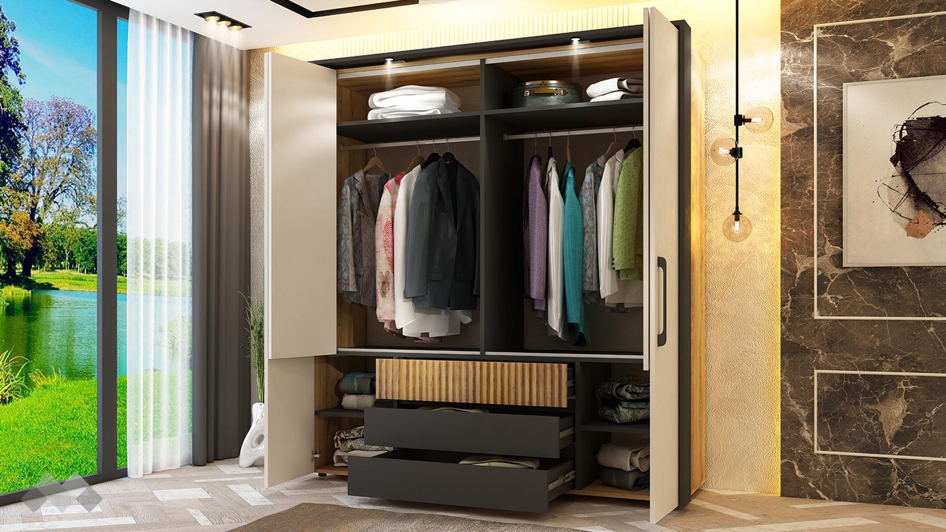 Впечатляващият четирикрилен гардероб с три чекмеджета осигурява изобилие от пространство за съхранение. С вътрешно разпределение от рафтове, лостове и чекмеджета, той е изключително функционален, а вратите в кашмири челата на чекмеджетата в дъб евок и графит, създават елегантен и балансиран визуален ефект.LED осветлението над вратите придава допълнителна елегантност и практичност, особено при слаба осветеност. Вратите на гардероба с механизъм “хармоника” и механизъм за плавно затваряне, а чекмеджетата са с телескопични водачи позволяващи пълно изтегляне.