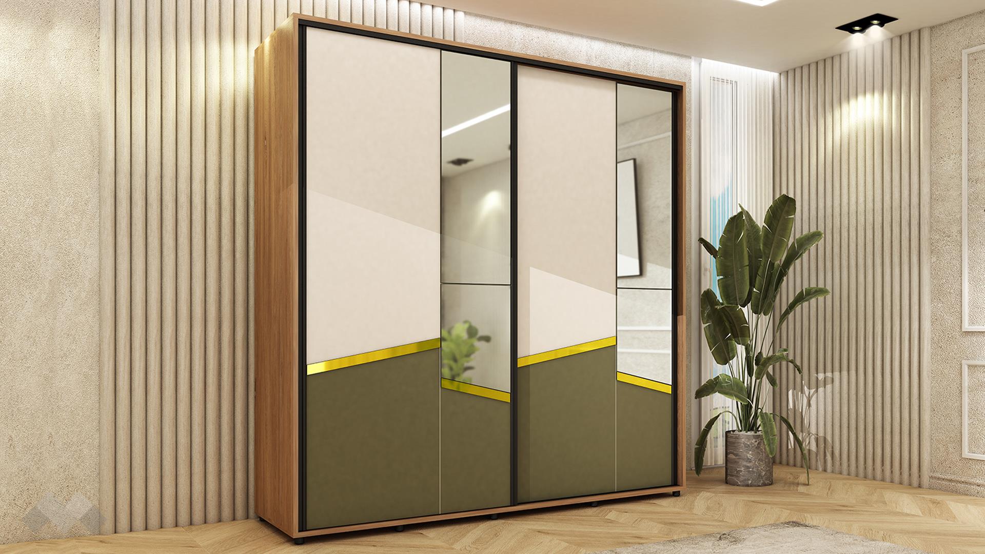 Гардеробът с плъзгащи врати е завършен с огледалните врати и асиметричен дизайн в три зони: маслиненозелено, кашмир и златен акцент, които създават изразителна визуална динамика. Плъзгащият механизъм е практичен, подходящ за ограничени пространства, а вътрешното разпределение е проектирано с мисъл за подредба и удобство.В лявата страна на гардероба има лостове за закачалки на две нива, а от другата страна има три рафта, за да съхраниш още дрехи и вещи.