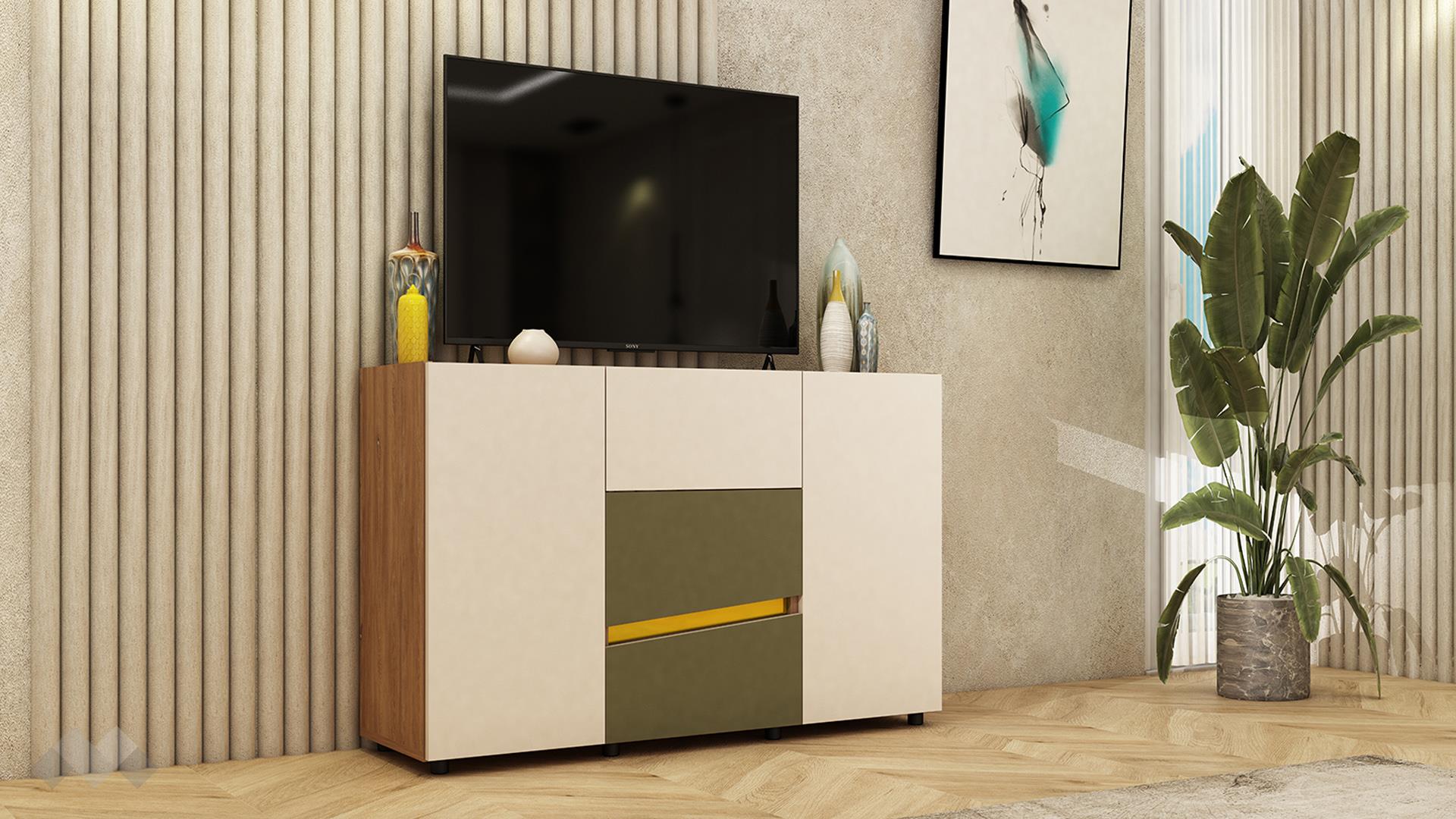 Скринът с три чекмеджета и две врати, зад които се крият в лявата рафт, а в дясната просторен шкаф е изчистен, но ефектен – повтаря цветовата тема на гардероба и добавя стабилна повърхност, подходяща както за телевизор, така и за декорация или огледало.