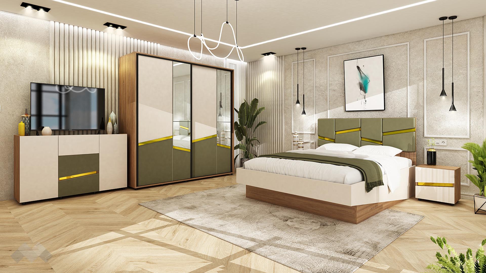 Централно място заема спалнята с висока тапицирана табла за матрак 160/200, съставена от модулни панели в маслиненозелено със златни декоративни ленти, които се повтарят и върху гардероба и скрина. Таблата е не само стилна, но и изключително комфортна за облягане.