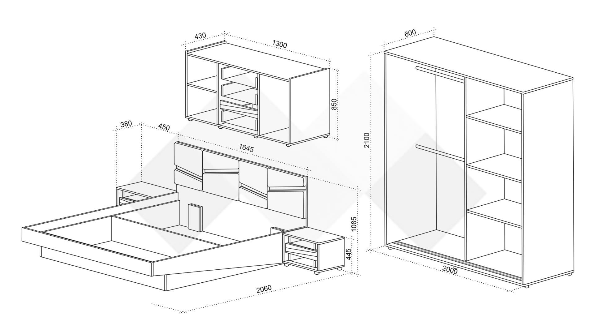 ✓ спалня ✓ 2 нощни шкафчета ✓ гардероб с плъзгащи врати ✓ огледала ✓ скрин с 2 врати и 3 чекмеджета ✓ телескопични водачи при чекмеджетата ✓ амортисьорен механизъм ✓ модерен декор ✓ качествена изработка ✓ 16 мм ПДЧ