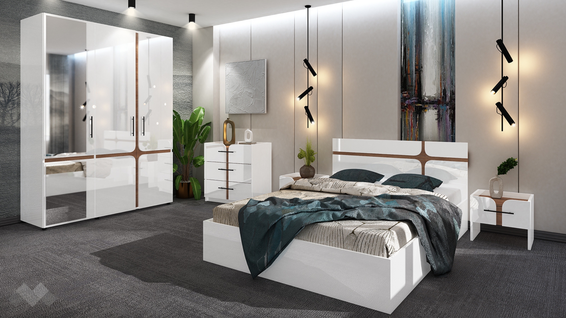 Този изискан спален комплект съчетава модерен стил, функционалност и усещане за простор. Изработен в елегантен бял гланц, с декоративни акценти в топлия и естествен нюанс дъб денвър, той придава свежест и светлина на интериора, като същевременно осигурява необходимия комфорт и ред във всекидневието.