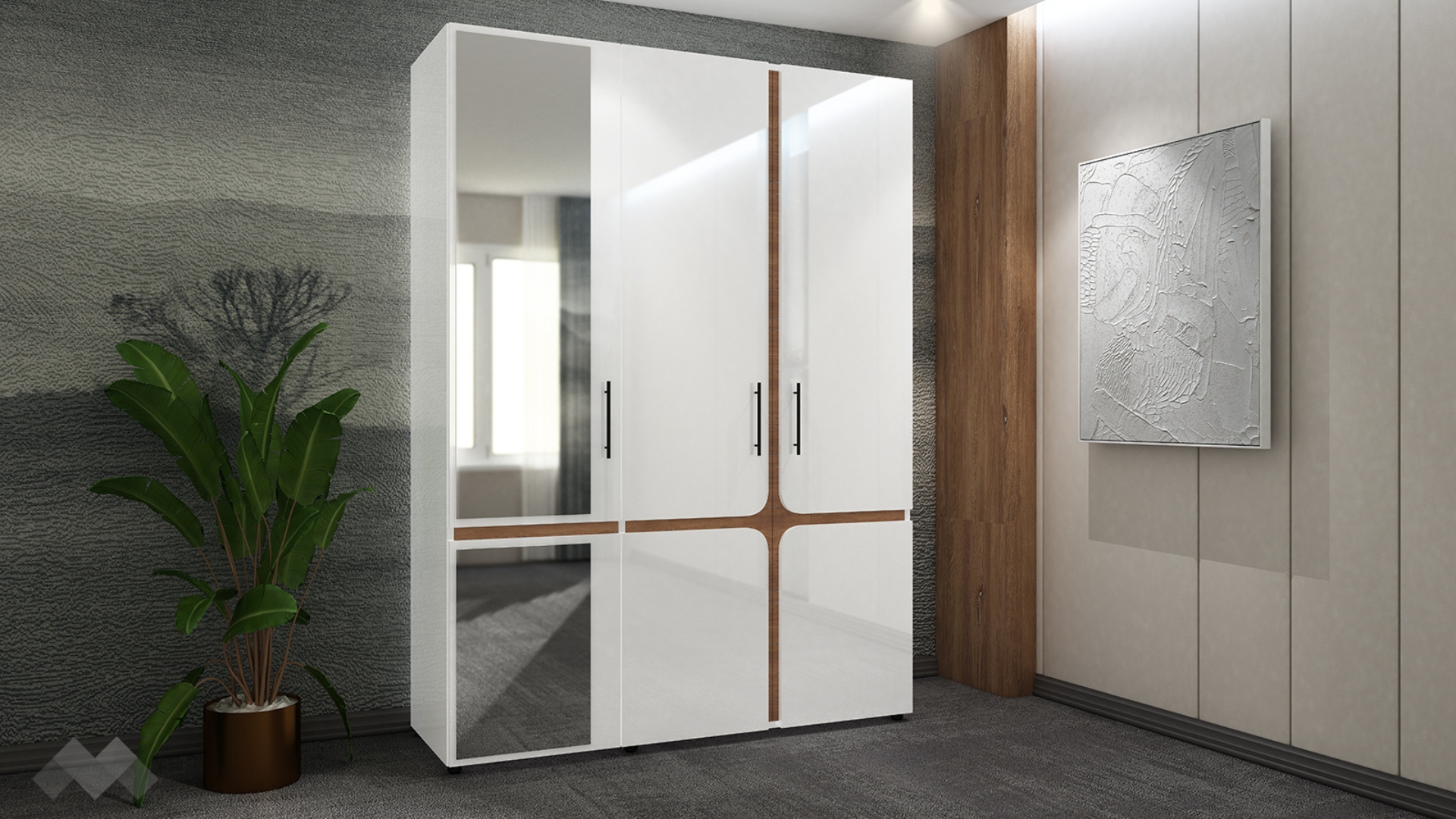 Трикрилният гардероб впечатлява със своята вместимост и голямо огледало на една от вратите. Съчетава рафтове и лост за закачалки, осигурявайки отлично организирано пространство за дрехи и аксесоари. Гланцовите фронтове визуално разширяват помещението, а дървесният акцент внася топлина и характер.