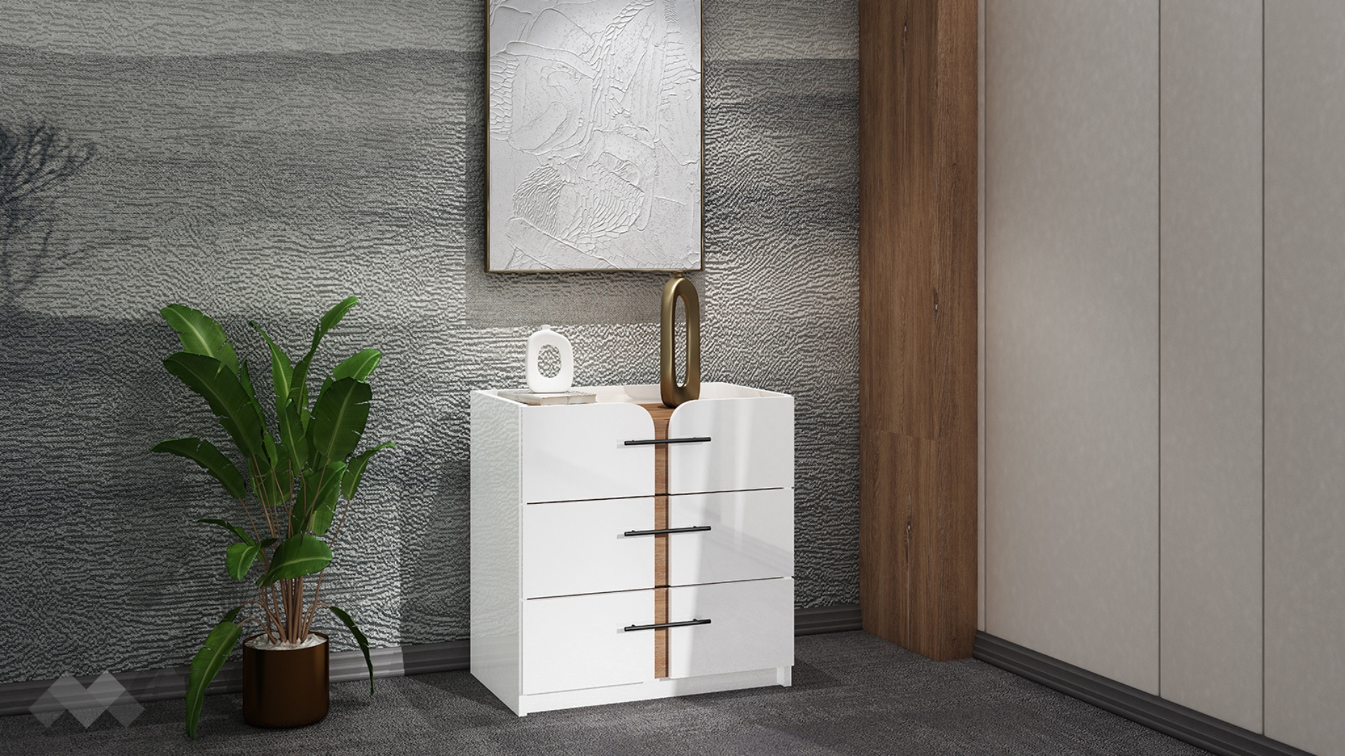 Комплектът се допълва от компактен скрин с три чекмеджета, който е идеален за подредба на бельо, козметика или други вещи. Плотът му предлага допълнителна повърхност за декоративни елементи като лампа, ароматна свещ или рамка със снимка.