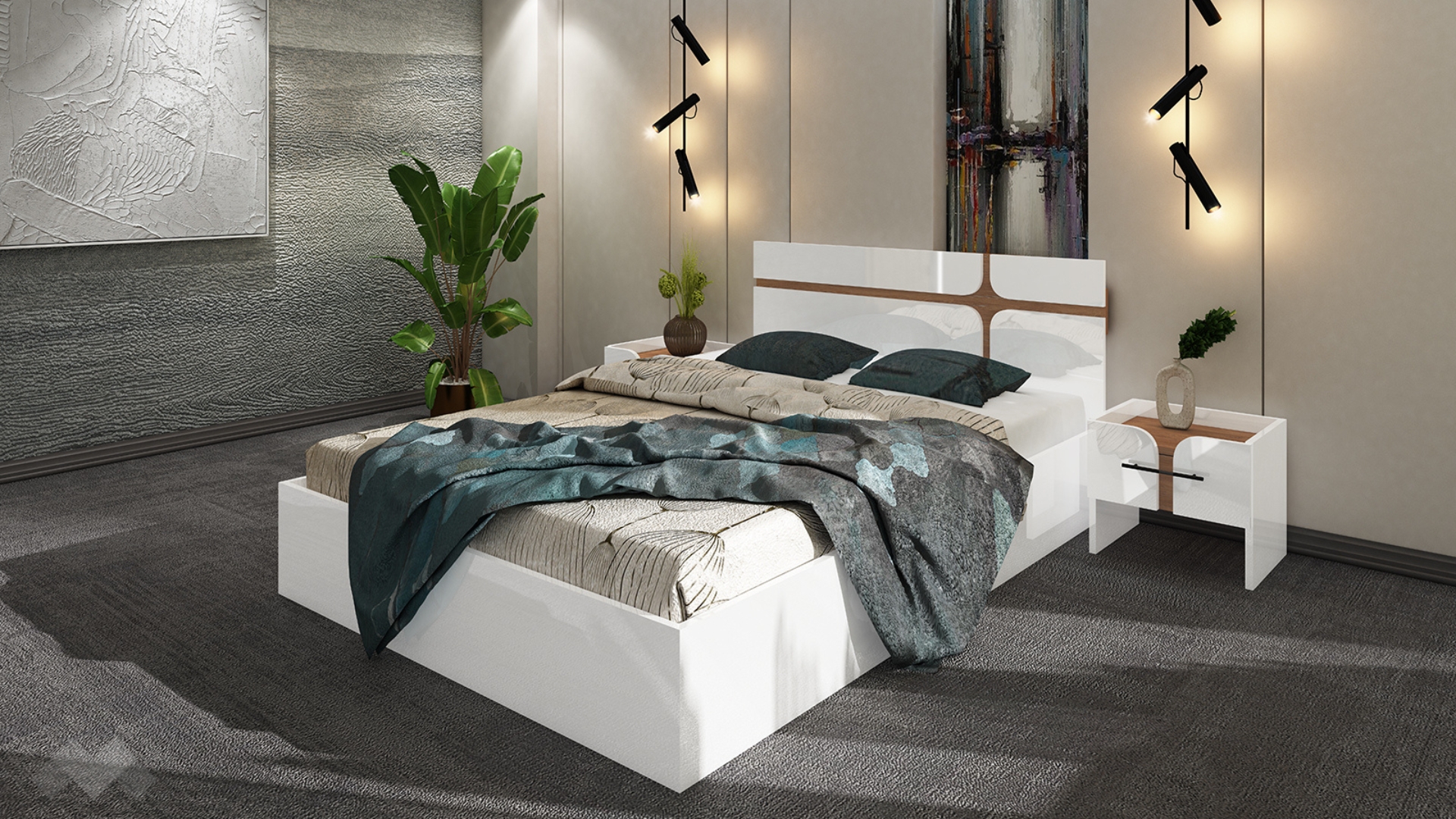 Централният елемент на комплекта е просторната спалня подходяща за матрак 160/200, придружено от две нощни шкафчета с изчистен дизайн – идеални за съхранение на книги, зарядни устройства и лични вещи. Шкафчетата са с удобна височина, което допринася за удобството. Акцентът от дъб върху таблата на спалнята и плота на нощните шкафчета подчертават естествения характер на дизайна и създават приятен визуален контраст.