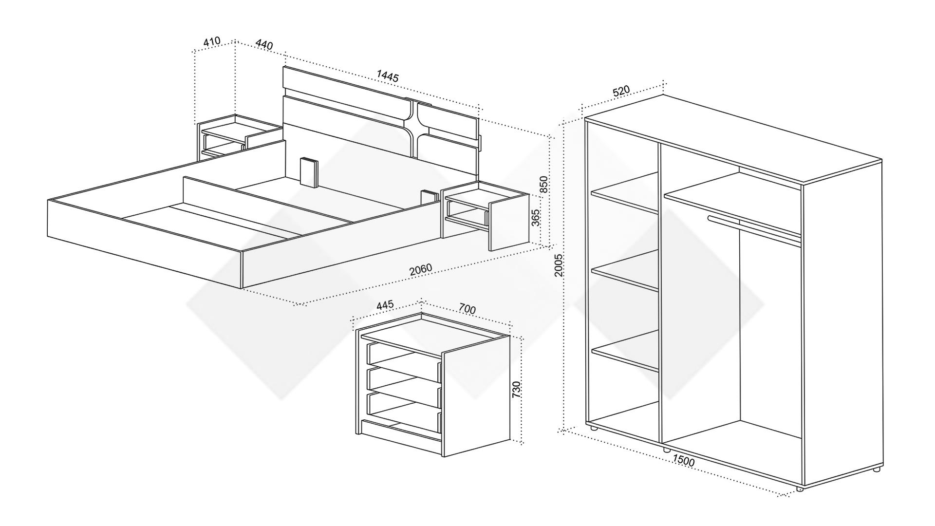 ✓ спалня ✓ 2 нощни шкафчета ✓ трикрилен гардероб с огледало ✓ скрин ✓ модерен декор ✓ амортисьорен механизъм ✓ механизми за плавно затваряне на вратичките ✓ качествена изработка ✓ 16 мм ПДЧ